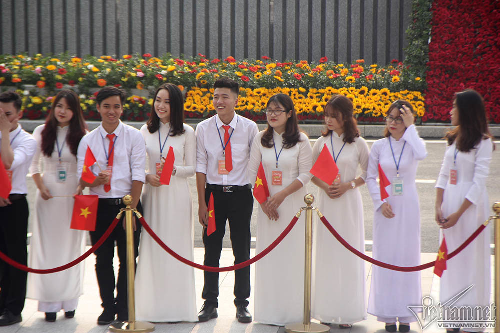 Hàng trăm sinh viên và du học sinh của 2 nước có mặt để chào đón lãnh đạo hai nước. 100 sinh viên Học viện Ngoại giao gốm 50 sinh viên nam và 50 sinh viên nữ, chủ yếu là sinh viên năm cuối đã ra đón đoàn.