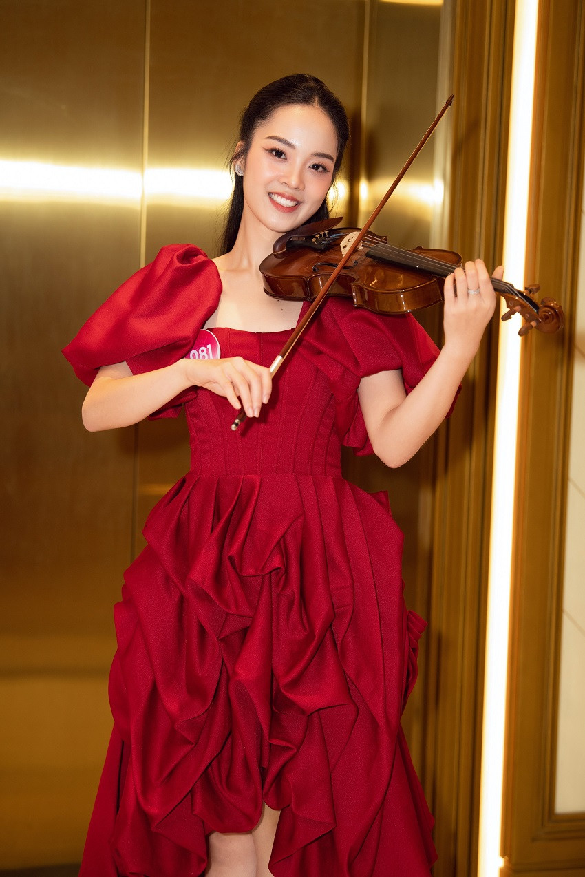 Trần Gia Hân (SBD 081), lọt top 35 Hoa hậu Việt Nam 2022, cao 1,72 m, gây ấn tượng với nhan sắc trong trẻo và tài năng chơi đàn vĩ cầm điêu luyện.