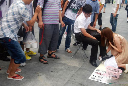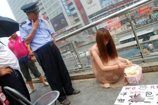 Gần đây, một cư dân mạng đã phát hiện một thiếu nữ xinh đẹp đang quỳ gối đánh giày trên cầu đi bộ ở thành phố Bắc Kinh, bên cạnh còn có tấm biển: "Không cần người nuôi dưỡng, chỉ cần kiếm được việc làm".
