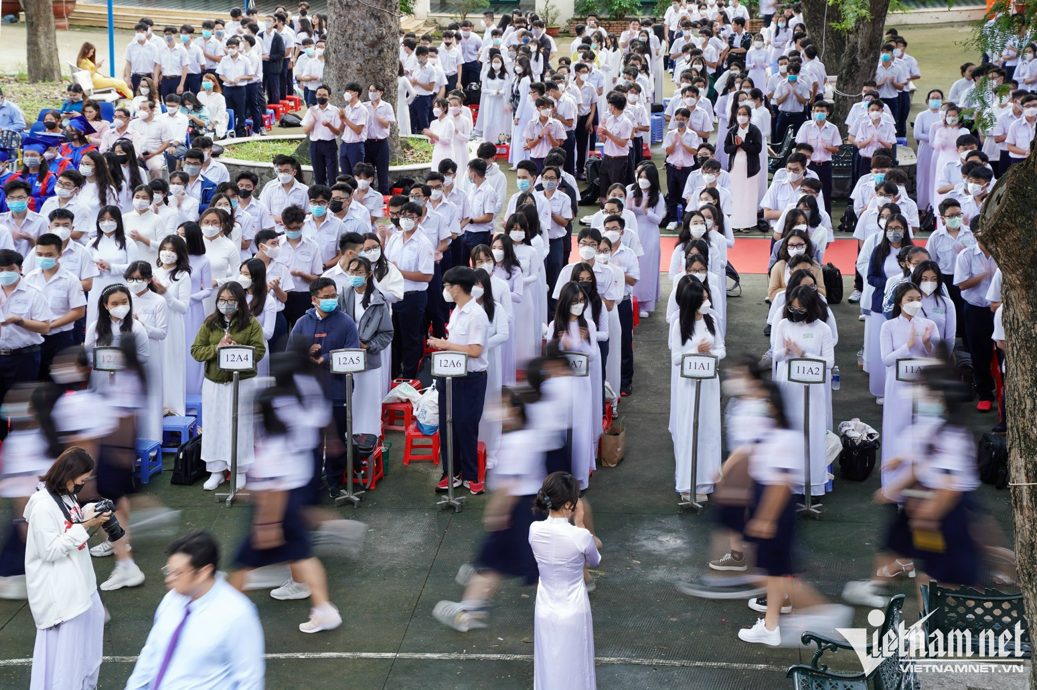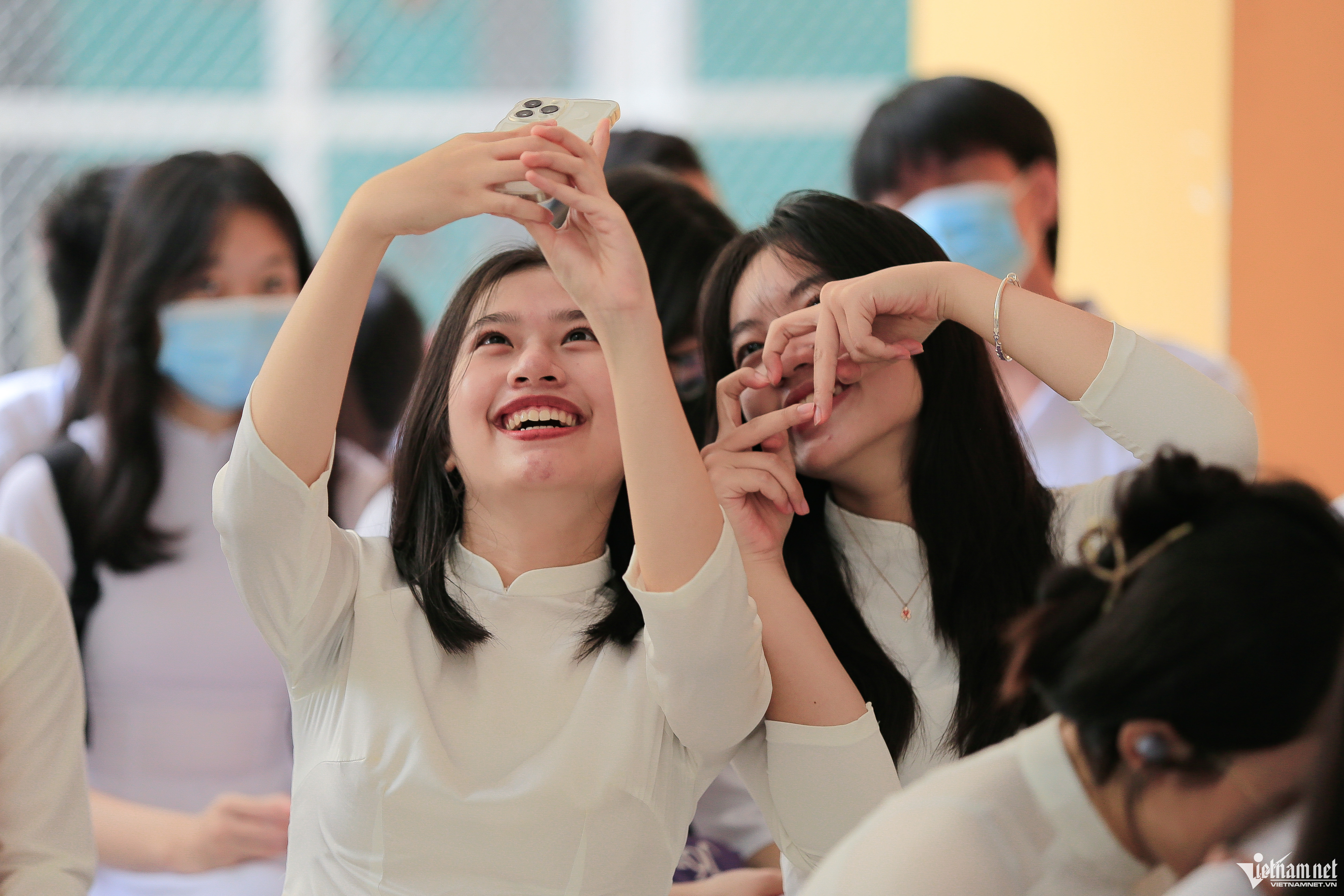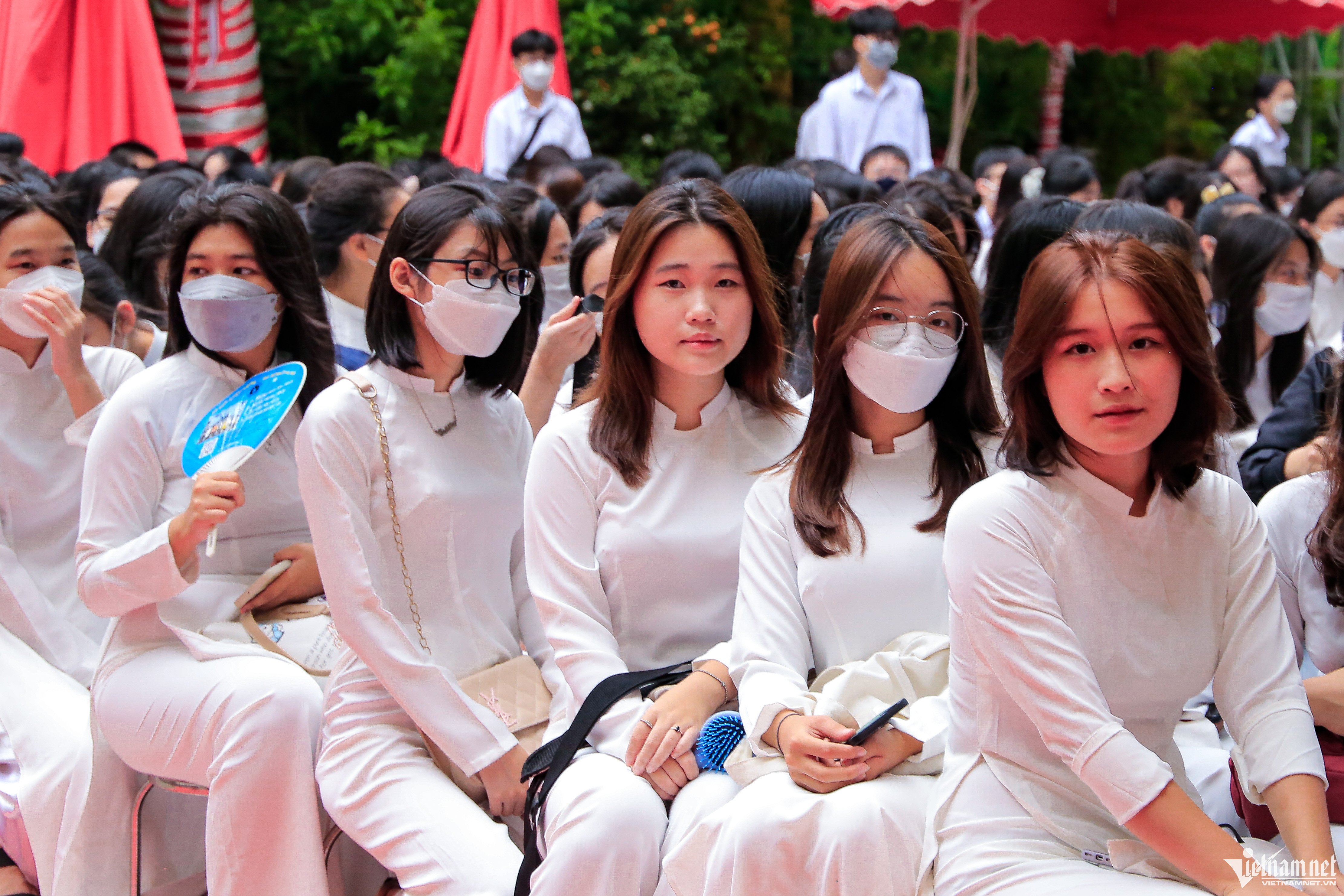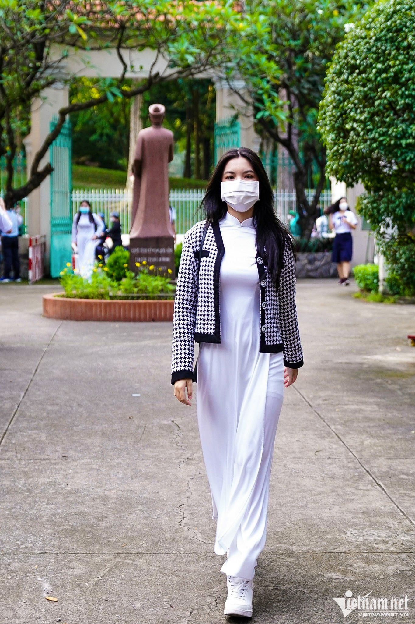 Tại trường THPT Lê Quý Đôn (quận 3, TP.HCM), nhiều nữ sinh mặc áo dài có mặt từ rất sớm để tham dự lễ khai giảng. Năm nay, trường tổ chức khai giảng nhanh gọn, nhưng không thiếu phần ý nghĩa và trang trọng. 562 học sinh khối 10 được chào đón nồng nhiệt. Qua đó, nhà trường cũng tuyên dương em Phạm Song Thư, học sinh lớp 10A1 có điểm số cao nhất trong kỳ thi tuyển sinh lớp 10 năm học 2022-2023 với 28,25 điểm.Phạm Gia Hân (học sinh lớp 12) cho biết, cảm xúc rất khác lạ. “Hôm nay đại diện trường để dẫn lớp 10A14 vào em rất bồi hồi, nhớ lại kỷ niệm cũ ngày mới nhập trường”, Hân chia sẻ.Trong không khí đón chào năm học mới, Diễm Ngân nhớ lại ngày đầu bước chân vào trường, cảm giác vui và hồi hộp.Vân Anh cho biết tiếc nuối vì năm vào lớp 10 thì bị dịch Covid-19 hoành hành đã không thể có được buổi khai giảng ý nghĩa như năm nay.Một nữ sinh trường THPT Lê Quý Đôn (quận 3, TP.HCM) duyên dáng trong tà áo dài trắngSáng 5/9, thời tiết tại Hà Nội có gió, nắng nhẹ, thuận lợi cho lễ khai giảng. Hình ảnh tại trường THPT Trần Nhân Tông (quận Hai Bà Trưng, Hà Nội).Minh Đức, Ngọc Mai và Kiều Anh vui mừng khi đây là lễ khai giảng đầu tiên mà 3 người cùng nhau tham dự. “Năm ngoái do dịch bệnh, toàn bộ học sinh phải dự lễ khai giảng qua màn hình máy tính. Sau gần 1 năm xa cách chúng em cảm thấy vui vì được học tập và làm việc chung với nhau”, Ngọc Mai (giữa) chia sẻ.Nhóm bạn Đặng Phương và Thuỷ Tiên lớp 12A4 ngồi túm tụm trò chuyện rôm rả. Các bạn cho biết đây là lễ khai giảng cuối cùng cũng là ngày đáng nhớ nhất trong 3 năm THPT.Anh Thư và Quỳnh Thư (lớp 10A12) tâm sự: "Chúng em cảm thấy rất háo hức và đã chuẩn bị từ sớm. Đây là lễ khai giảng đầu tiên ở một môi trường mới. Hôm nay, sau khi buổi khai giảng kết thúc, hai chúng em sẽ chụp thật nhiều ảnh đẹp với áo dài trắng".