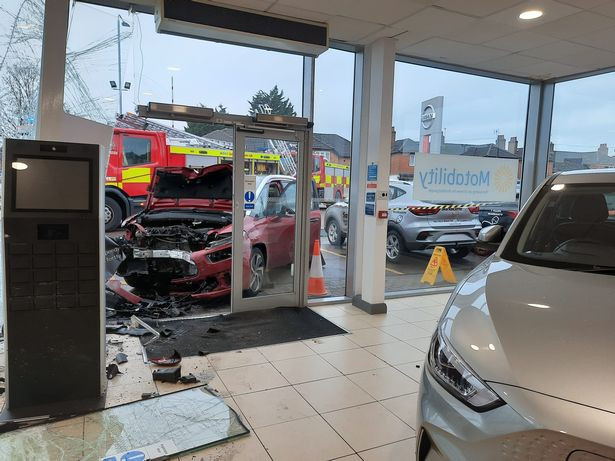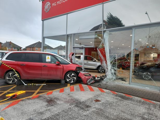 Một nữ tài xế lái chiếc Citroen Picasso đã lao thẳng vào một showroom ô tô MG tại đường Derby, thị trấn Loughborough (Anh quốc) sau khi va chạm với một phương tiện khác ở trên đường.