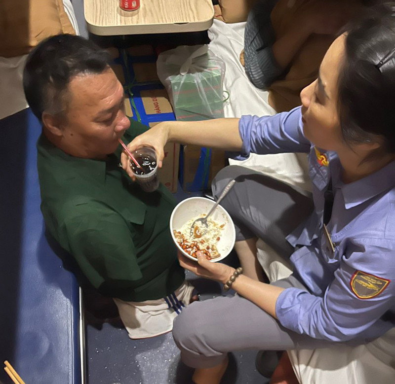Chị Hoa chăm sóc một người khuyết tật trên tàu