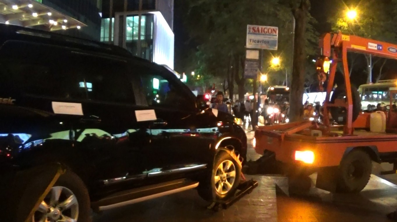 | Tài xế định lái chiếc ô tô màu đen, biển số ngoại giao (trước đó đã niêm phong) rời khỏi vị trí thì bị Phó chủ tịch quận 1 yêu cầu CSGT chặn lại, niêm phong lần 2 và cẩu đi. |