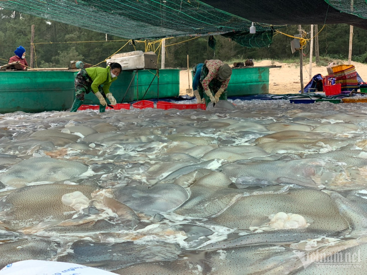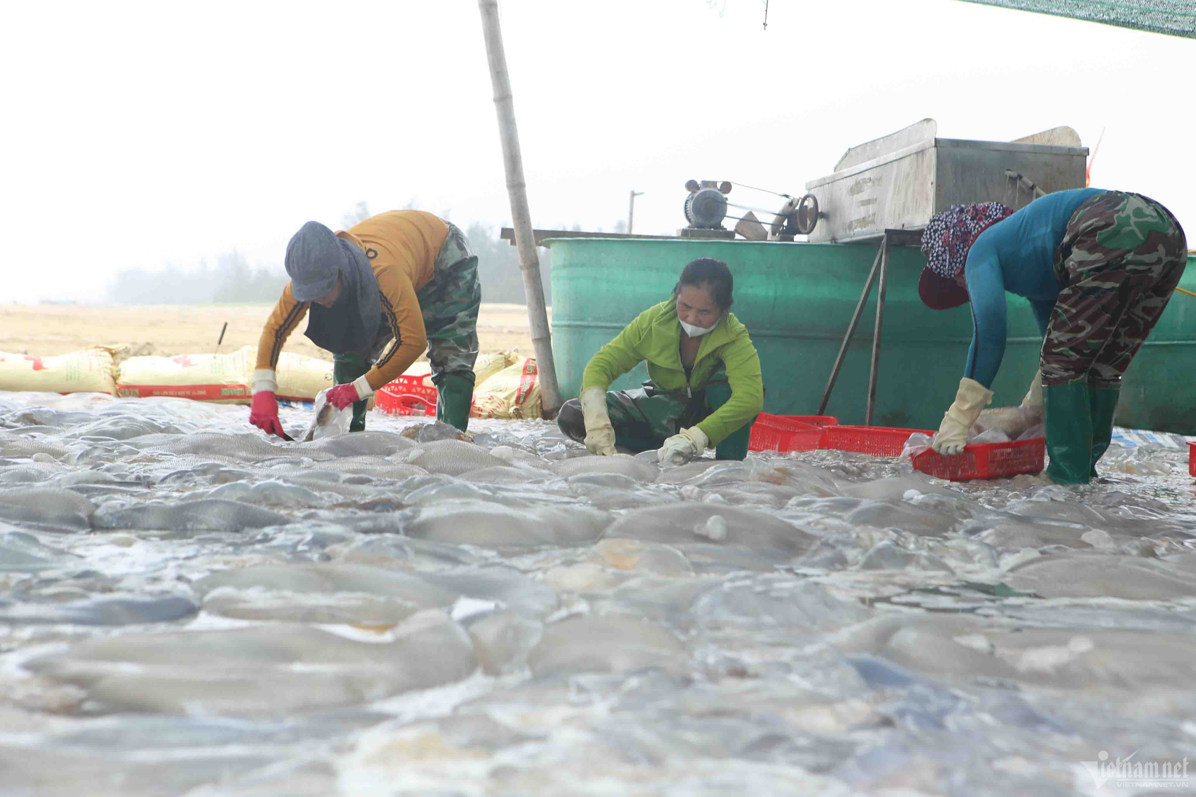 Ngư dân xã Thạch Trị, Thạch Văn (huyện Thạch Hà, Hà Tĩnh) cho biết, sứa biển đang vào vụ cuối mùa. Tranh thủ những ngày này, họ dùng thuyền nan, ra biển từ 12h đêm để thả lưới đánh bắt sứa cách bờ khoảng 2 hải lý. Sau mỗi chuyến đi, mỗi thuyền đánh bắt được khoảng 2-5 tấn sứa, trừ hết chi phí ngư dân thu về từ 1-4 triệu đồng.