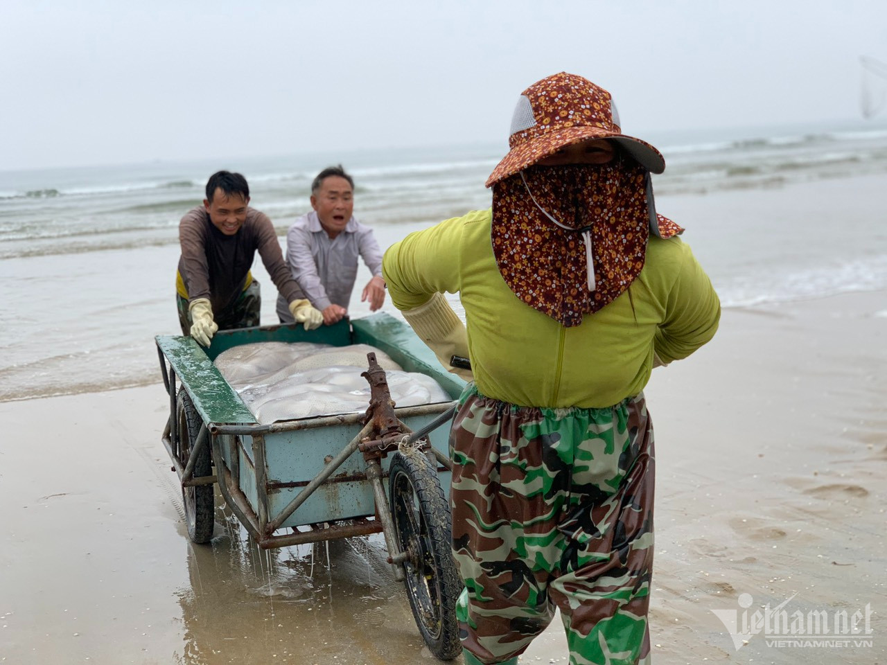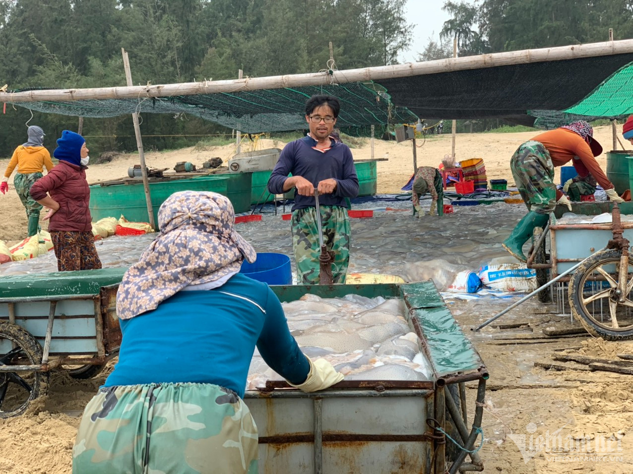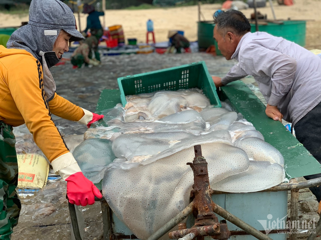 Dọc bờ biển ở xã Thạch Văn, nhóm tiểu thương tận dụng bãi cát để tập kết, thu mua sứa từ những ngư dân ra khơi trở vềNgư dân xã Thạch Văn, Thạch Trị kéo sứa đưa lên gần bờ để bán lại cho tiểu thươngMùa sứa ở xã Thạch Văn bắt đầu từ tháng 2 đến tháng 3 Âm lịch. Ngư dân dùng thuyền nan, công suất nhỏ đánh bắt sứa cuối mùaMỗi ngày ngư dân đi đánh bắt hai chuyến sứa, chuyến đầu từ 12h đêm đến 7h sáng và chuyến sau từ 9h sáng đến 15h chiềuHọ dùng lưới đánh bắt sứa cách bờ khoảng 2 hải lýSau khi đánh bắt sứa đầy thuyền nan, ngư dân đưa sứa từ thuyền xuống xe bò kéo để đưa lên bờSứa là loại động vật thân mềm, là lớp nhuyễn thể, sống ở môi trường nước, có khả năng di chuyển dưới nước khi co bóp dù và đẩy nước qua lỗ miệng, đồng thời tiến về phía ngược lại. Một con sứa sống nặng từ 5 đến 50 kg, nhiều con nặng 60-70 kg.Ông Nguyễn Đình Loan (64 tuổi, trú thôn Toàn Thắng, xã Thạch Trị) cho hay, mỗi ngày thuyền của ông đánh bắt được khoảng 2 tấn sứa. Sứa nặng, mỗi chuyến đưa lên bờ phải có nhóm khoảng 3 người đẩy xe Mỗi kg sứa, ngư dân nhập cho thương lái 15.000 đồngCông việc dù vất vả, rủi ro nếu gặp sóng to, gió lớn. Tuy nhiên, ngư dân cho biết, nghề sứa mang lại thu nhập khá ổn địnhỞ Hà Tĩnh, sứa được chế biến thành gỏi, kẹp bánh khô, ăn kèm rau canh giới, chuối xanh, bỏ thêm lạc rang, rưới ít ruốc được nêm nếm ớt, chanh... Ngoài ra ngư dân còn nộm, muối sứa bán.Điểm thu mua sứa của tiểu thương được bố trí ngay trên bờ. Sứa biển là thực phẩm bổ mát nên được nhiều thực khách lựa chọn là thức ăn để giải nhiệt vào những ngày hè oi bức.Sau khi chở sứa vào bờ, ngư dân lại đưa thuyền ra khơi để kịp chuyến sứa tiếp theo.