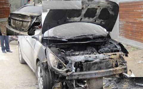 | Hiện trường chiếc ô tô Accent bốc cháy trong đêm. Ảnh CANA |