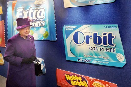 | Nữ hoàng Elizabeth II đi dạo trên nền quảng cáo kẹo cao su. |