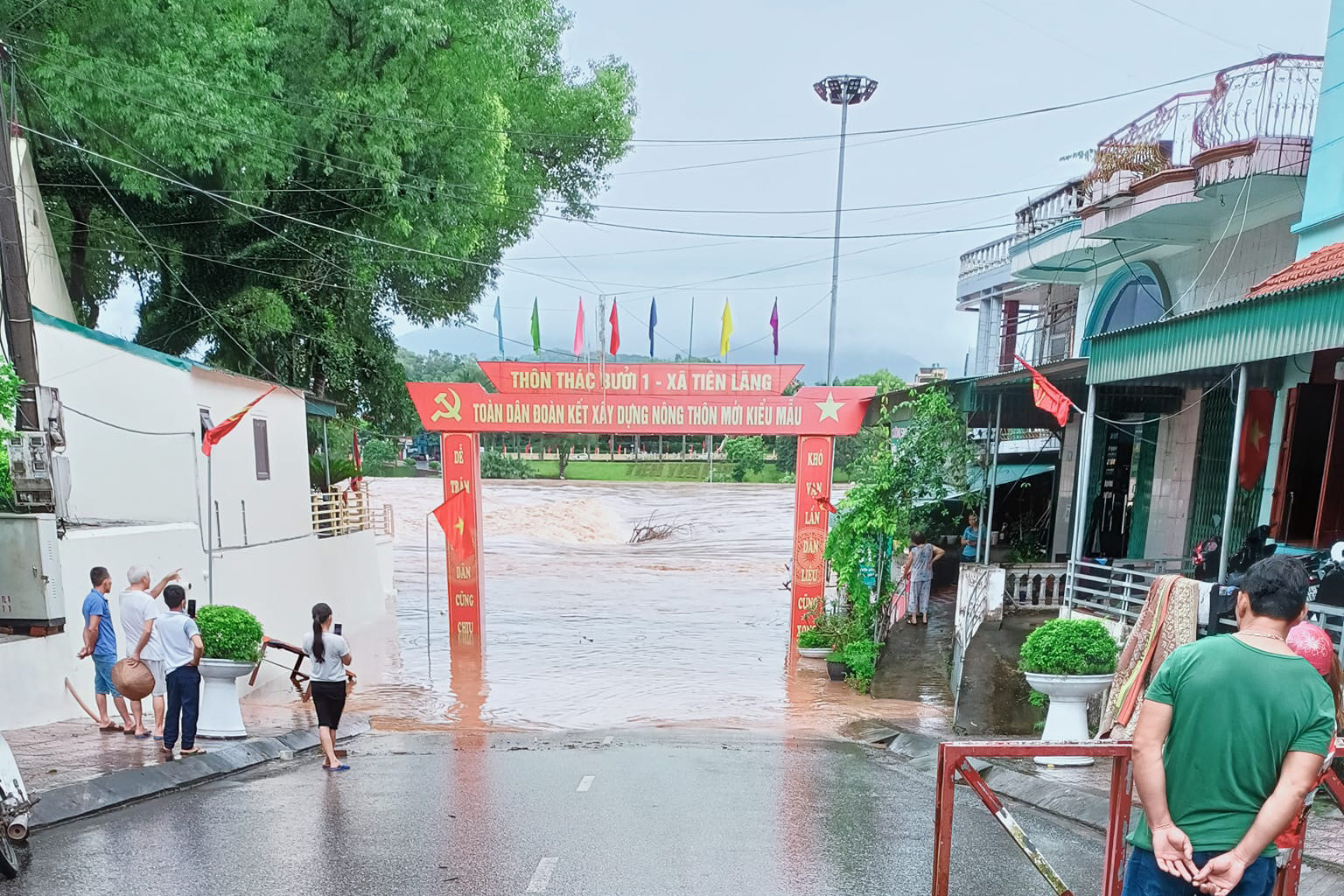Đường vào thôn Thác Bưởi 1, xã Tiên Lãng bị chia cắt do nước lũ dâng cao qua đập tràn.