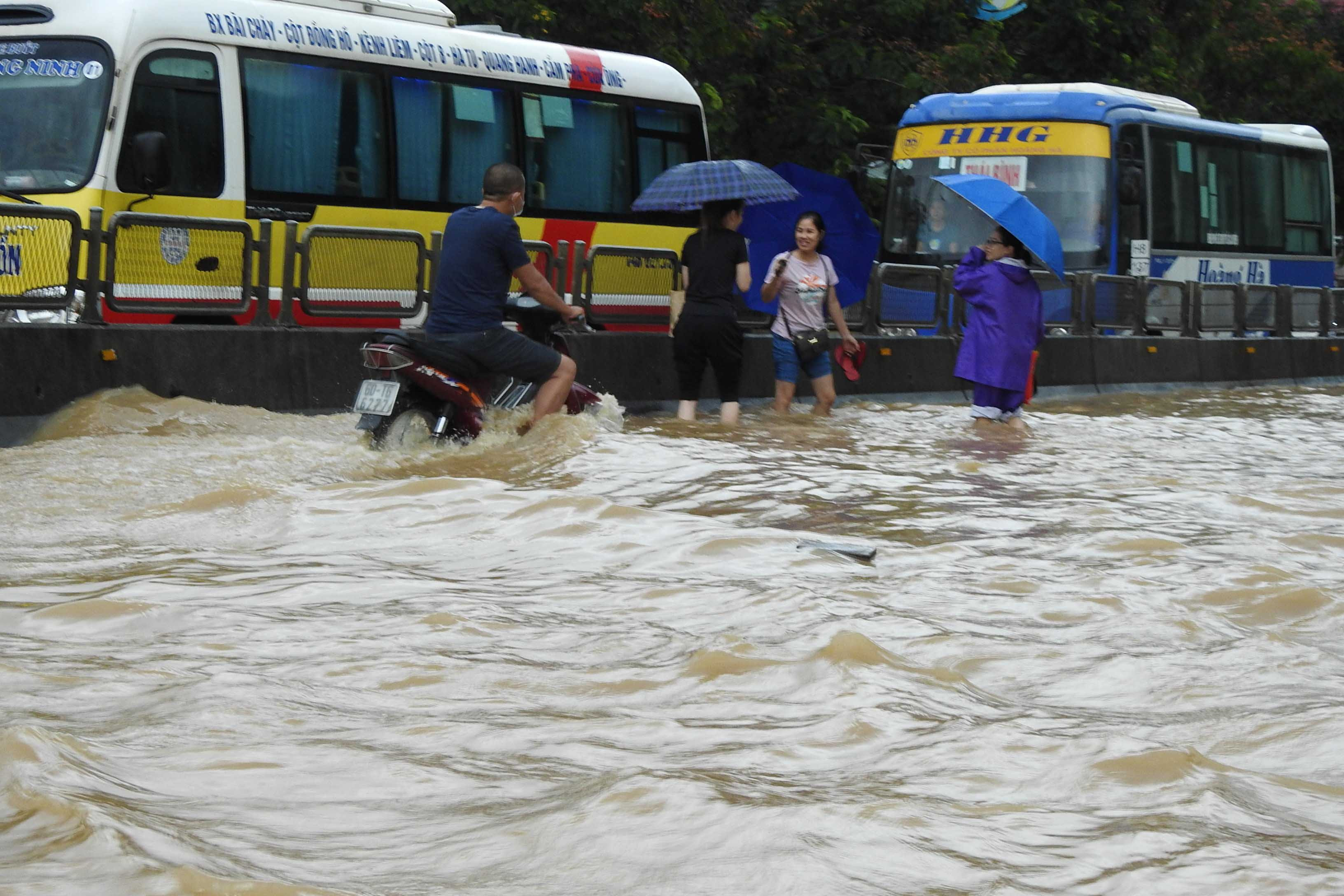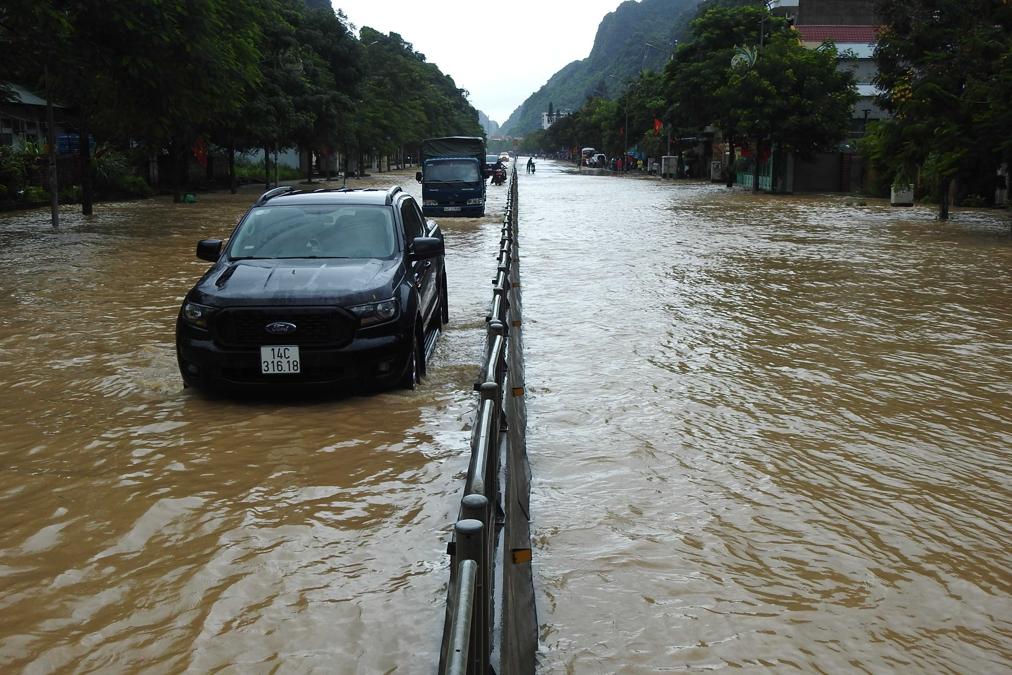 Ngập sâu nhất trên quốc lộ 18A là đoạn qua phường Quang Hanh, TP Cẩm Phả. Hàng loạt xe chết máy nhờ tới cứu hộ giao thông.