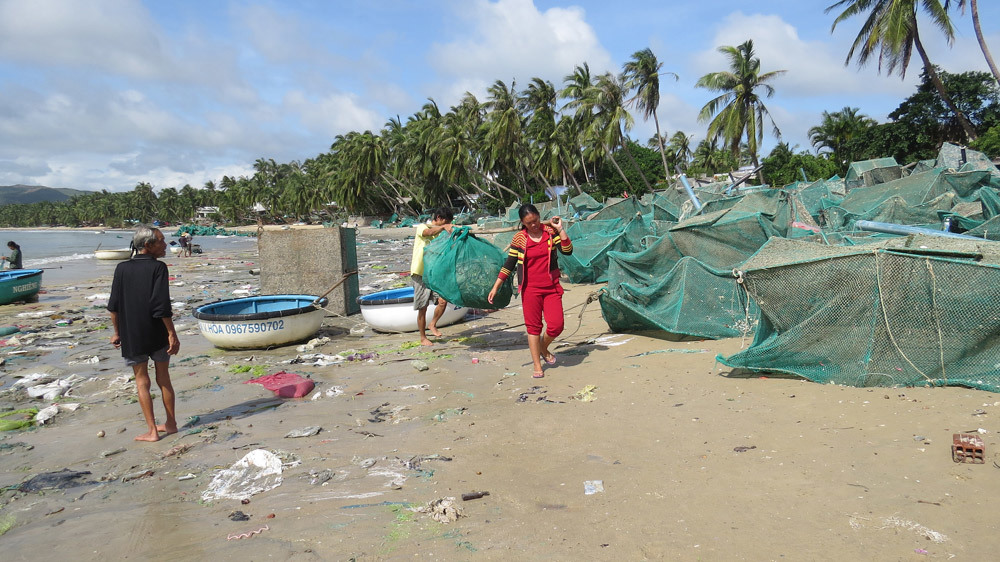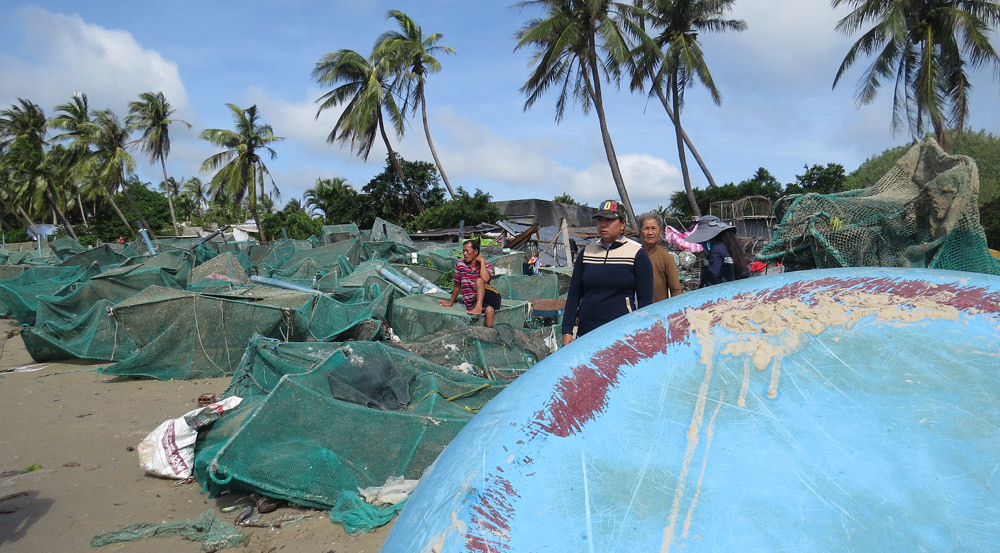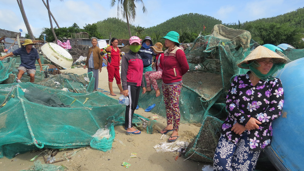 Dọc theo bờ đầm nhiều can nhựa, phuy nhựa, lồng nuôi trôi dạt vào bờ người dân gom lại chất thành “núi”. Sau bão 6 ngày, nước mắt người dân vẫn còn rơi.