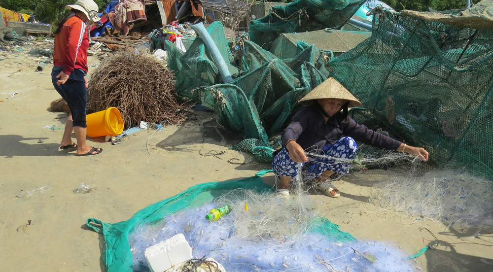 Người dân khiêng tấm lưới rách chất lên bờ.