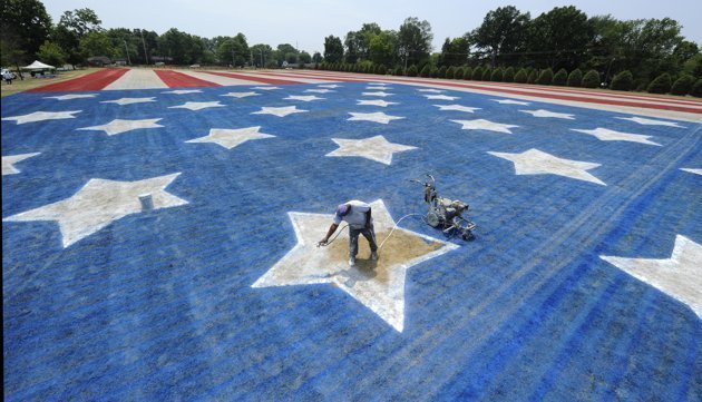 | Một lá cờ Mỹ khổng lồ ở Bowling Green, bang Kentucky đang được khẩn trương hoàn thiện. (Ảnh: AP) |