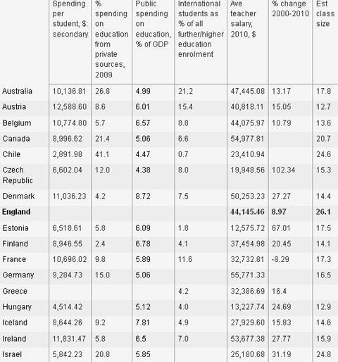 Anh có số học sinh/ lớp học cao nhất trong số các nước phát triển, chỉ sau Mexico và Thổ Nhĩ Kỳ, cụ thể là 26,1 học sinh/ lớp. Số học sinh/ giáo viên là 19,8 học sinh so với tỷ lệ trung bình của OECD là 15,7 học sinh/ giáo viên.