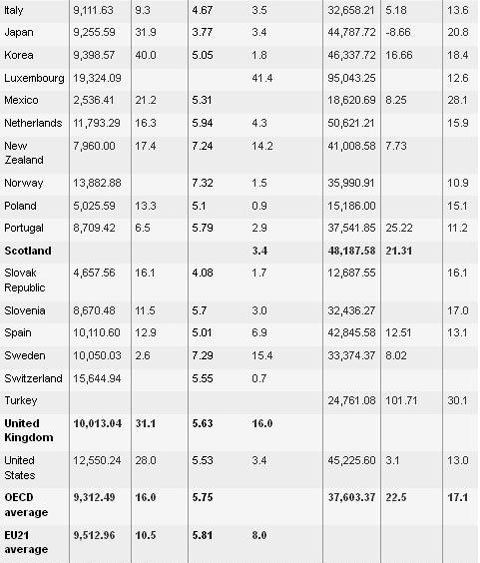 Scotland cũng có mức tăng lớn. Từ năm 2000 tới năm 2010, mức lương của giáo viên các cấp tiểu học, trung học và phổ thông tăng 21% - mức tăng cao thứ 7 trong khối OECD và tăng 4% điểm so với khối OECD. Ở Anh, lương của giáo viên các cấp tiểu học, trung học, phổ thông tăng 9%.
