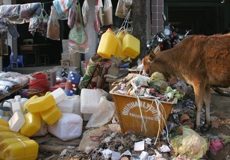 Thùng rác công cộng không có nắp đậy trở nên tiện lợi với những con bò quen kiếm ăn trên rác thải.