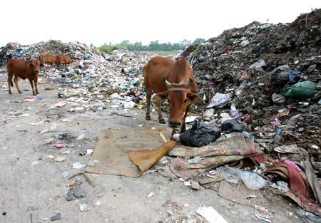 Cùng với vài người sống bằng nghề phân loại rác, những con bò này tìm kiếm thức ăn trong đống rác thải đủ loại.