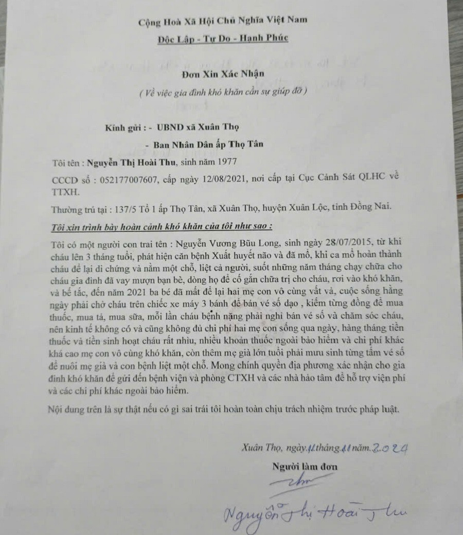 Bà Nguyễn Thị Hoài Thu (SN 1977) cố nén tràng ho, run rẩy kể lại những bất hạnh mà hai mẹ con đã và đang trải qua. Bà có bé trai Nguyễn Vương Bữu Long (SN 2015) khi đã 38 tuổi. Những tưởng con là món quà mà ông trời ban tặng khi đã lớn tuổi, đáng tiếc hạnh phúc lại ngắn ngủi.