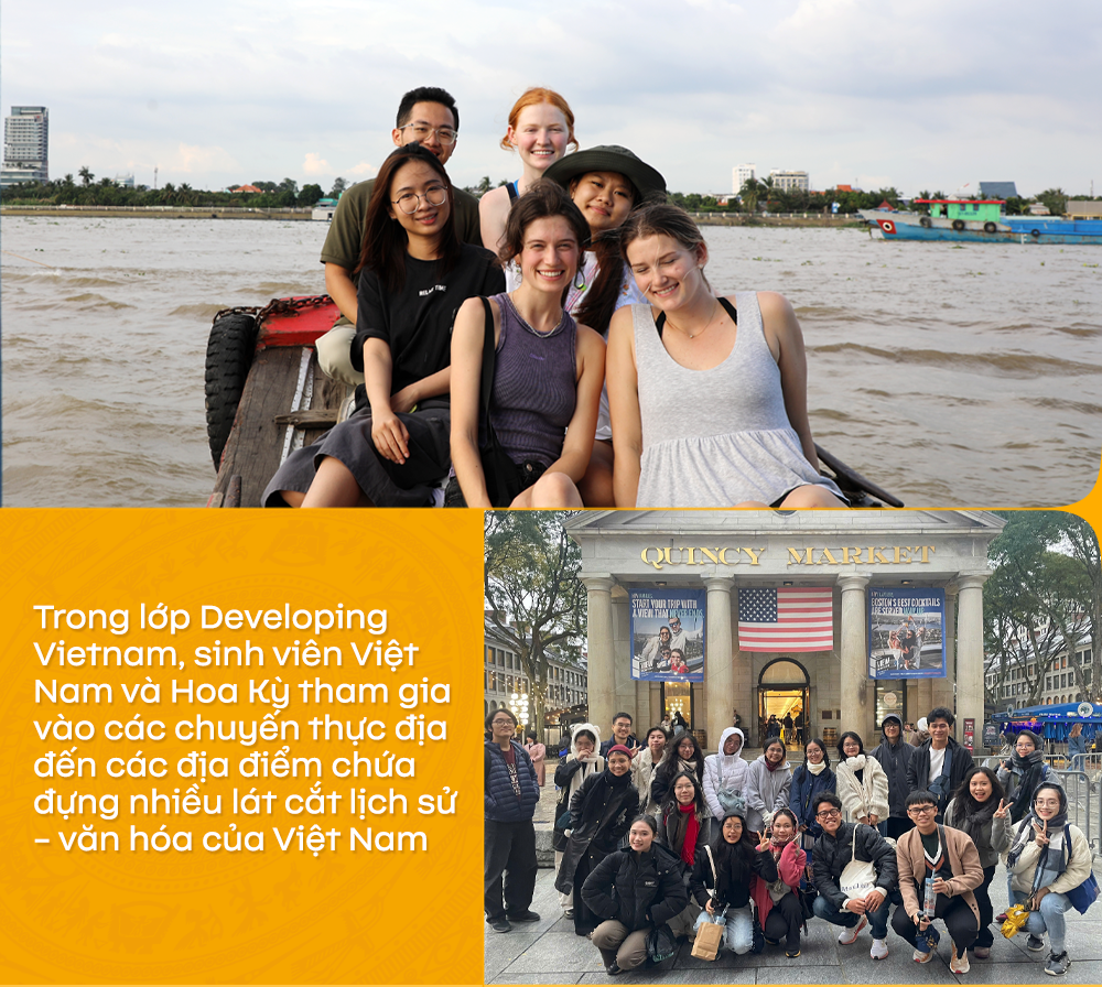 Một ví dụ tiêu biểu là lớp học “Việt Nam Trên Đường Phát Triển" (Developing Vietnam) - chương trình liên kết giữa Trường Fulbright Việt Nam và Đại học Dartmouth, một trong những trường đại học thuộc nhóm tám trường Ivy League hàng đầu tại Hoa Kỳ. Chương trình học mang đến một bức tranh toàn cảnh về Việt Nam, bao gồm lịch sử, tôn giáo, môi trường, và kinh tế, nơi sinh viên hai trường cùng tham gia những chuyến thực địa tại hai quốc gia Việt Nam - Hoa Kỳ. Đơn cử, vào tháng 12/2024 năm ngoái, các bạn sinh viên hai trường đã cùng nhau đến tham quan các địa điểm, tỉnh thành ở Việt Nam như Cần Giờ và Bến Tre, hoặc gần đây nhất vào tháng 10/2025, lớp học đã đến Hoa Kỳ để tham quan, nghiên cứu về những địa điểm chứa đựng nhiều lớp cắt về văn hóa - lịch sử Việt Nam.