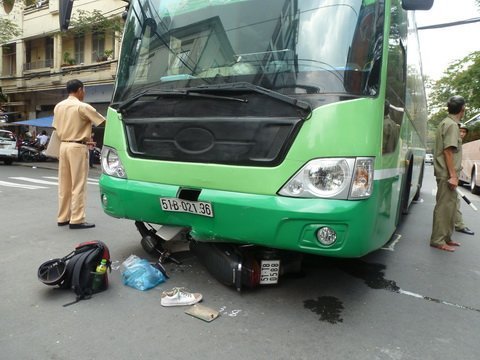 | Hiện trường vụ tai nạn, xe máy nằm gọn dưới gầm xe buýt |