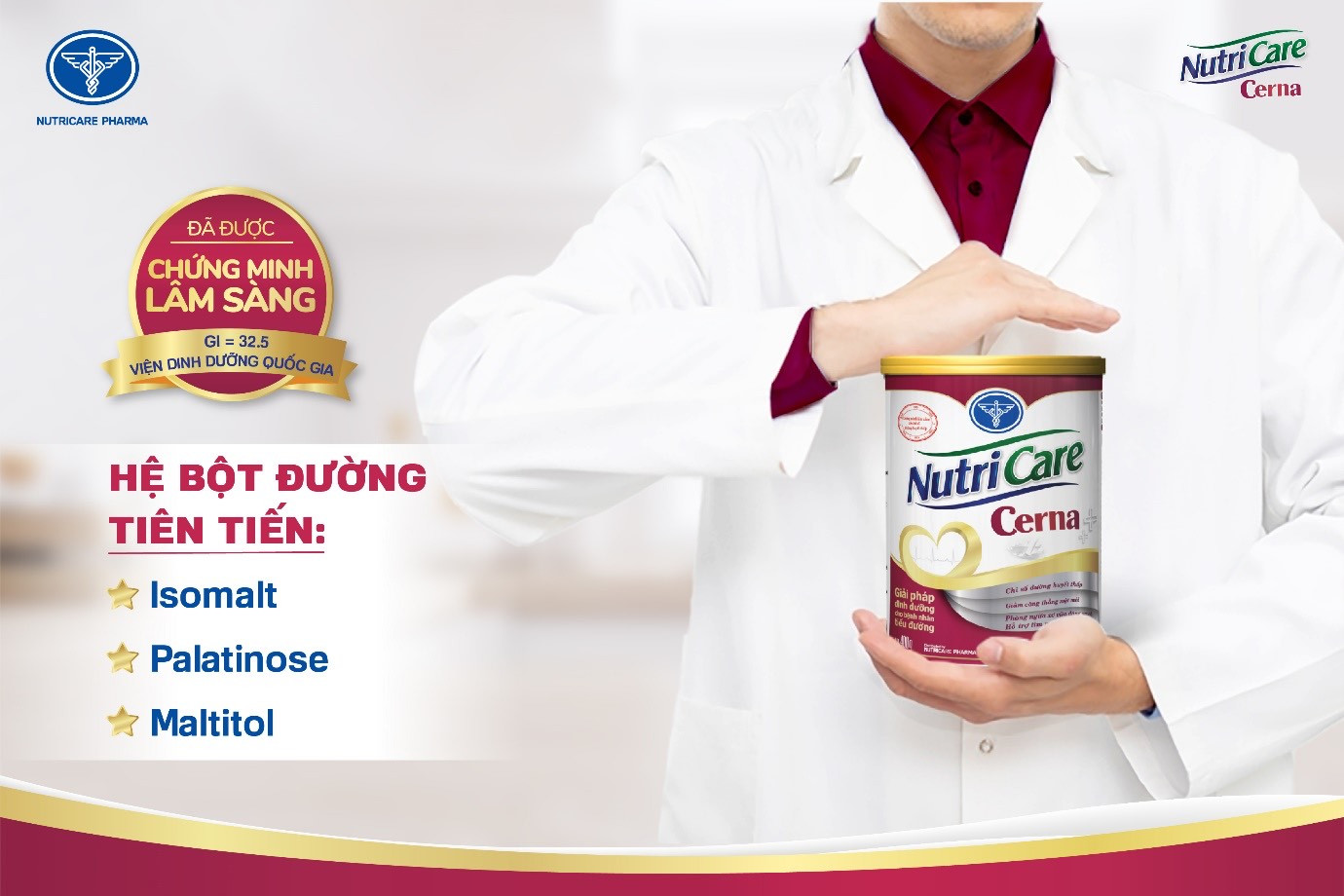 Mặc dù chứa hàm lượng dinh dưỡng cao nhưng Nutricare Cerna không gây tăng đường huyết là do sản phẩm có chỉ số đường huyết GI (Glycemic Index) ở mức thấp (chỉ 32,5) với hệ bột đường tiên tiến (Isomalt, Palatinose, Maltitol). Người tiểu đường được chuyên gia khuyến cáo nên ưu tiên lựa chọn các thực phẩm có chỉ số GI từ trung bình đến thấp bởi chúng không làm tăng Glucose máu nhiều sau ăn. Duy trì mức đường huyết ổn định sau ăn sẽ giúp phòng ngừa các bệnh liên quan đến chuyển hóa cũng như các biến chứng do tiểu đường gây ra.