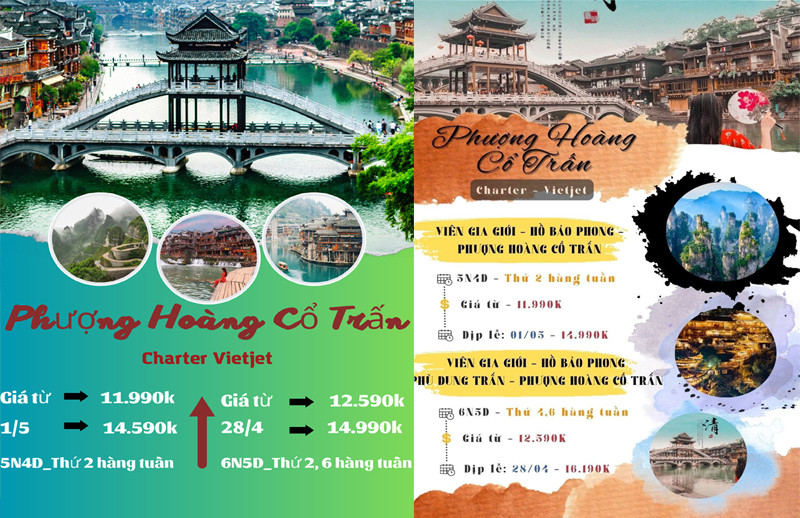 Với khách đi máy bay, tour Trương Gia Giới - Phượng Hoàng Cổ Trấn (6 ngày/5 đêm - bay charter), theo lịch sẽ khởi hành và thứ Tư, thứ Sáu hàng tuần cho giai đoạn từ tháng 4 đến tháng 10. Giá tour dao động từ 13-14 triệu đồng/khách, riêng dịp lễ 30/4-1/5 là 15 triệu đồng.
