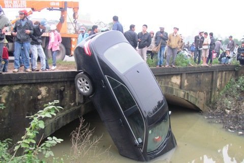 Trên xe có bốn người và may mắn đều thoát chết. Chiếc xe bị méo mó phần đầu. Hàng trăm người hiếu kỳ tụ tập đứng xế hộp cắm đầu dưới mương.