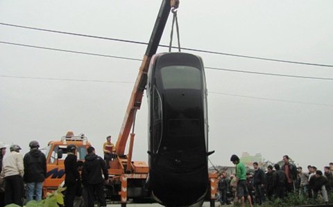 Lực lượng cứu hộ vớt “xế”dưới mương nước lên. Ảnh: ĐK