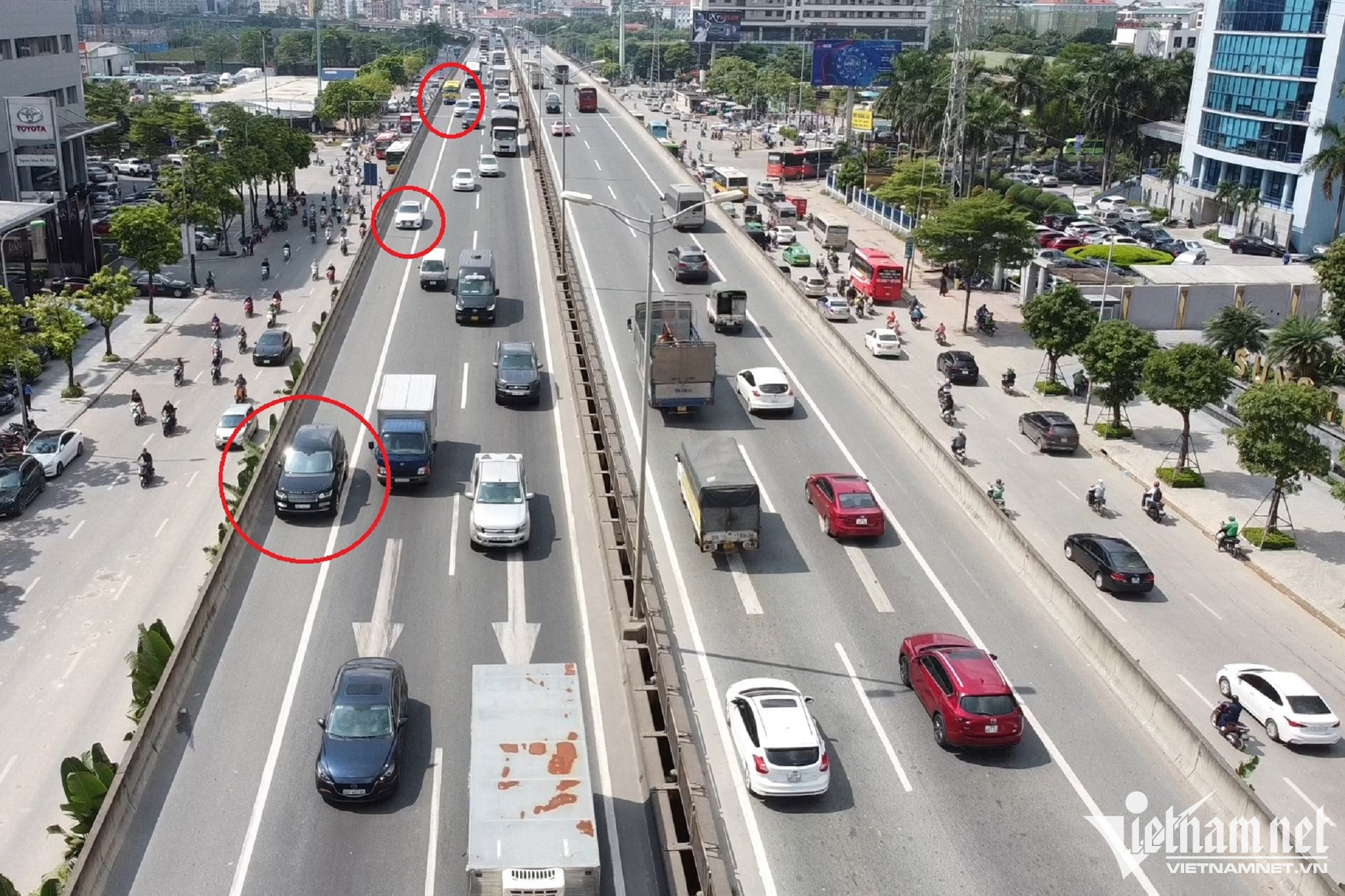 Sau khoảng 30 phút lập chốt xử lý ô tô đi vào làn dừng xe khẩn cấp ở đường Vành đai 3 trên cao (Hà Nội), Tổ công tác của Đội CSGT đường bộ số 6 (Phòng CSGT, Công an Hà Nội) liên tục phát hiện xe vi phạm.