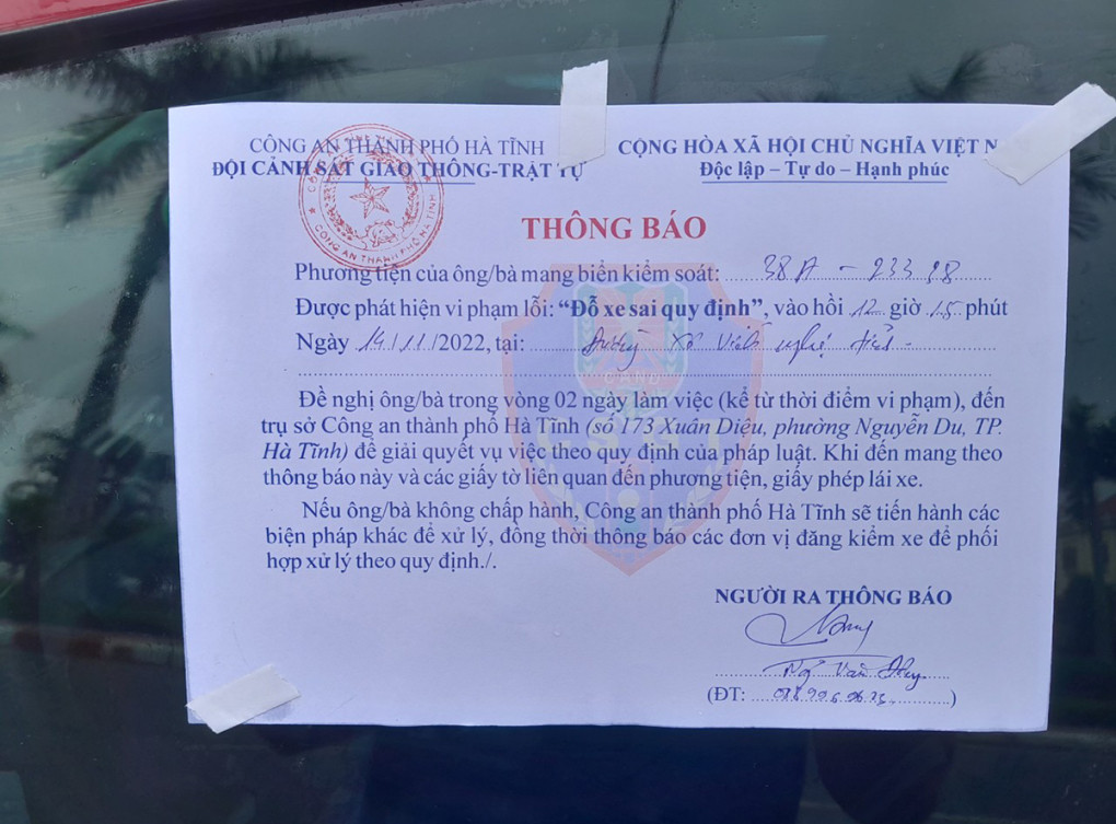 Từ ngày 5/11 đến nay, Công an TP Hà Tĩnh thực hiện chuyên đề xử phạt nguội với ôtô dừng đỗ sai quy định trên địa bàn. Đến nay Đội CSGT - Trật tự đã dán khoảng 100 thông báo với xe vi phạm, hiện đã có khoảng 50 tài xế tự giác đến nộp phạt.