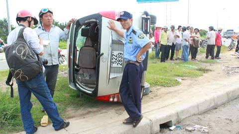 Ô tô bị lật chỏng chơ trên dải phân cách vì đuổi theo xe máy.