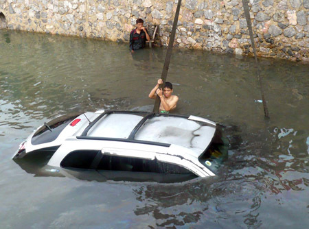 Khoảng 14 giờ ngày 14.6, tại tổ 4, khu 8, phường Hồng Hải, TP Hạ Long, Quảng Ninh, một chiếc ô tô Santafe đã lao xuống cống thoát nước bên đường sau khi tránh gấp một chiếc xe máy đi ngược chiều.