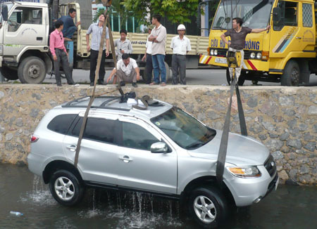 Do cống thoát nước rộng đến 10m, thành cao gần 3m nên phải mất hơn hai tiếng đồng hồ, lực lượng cứu hộ giao thông mới đưa được chiếc xe gặp nạn lên bờ.
