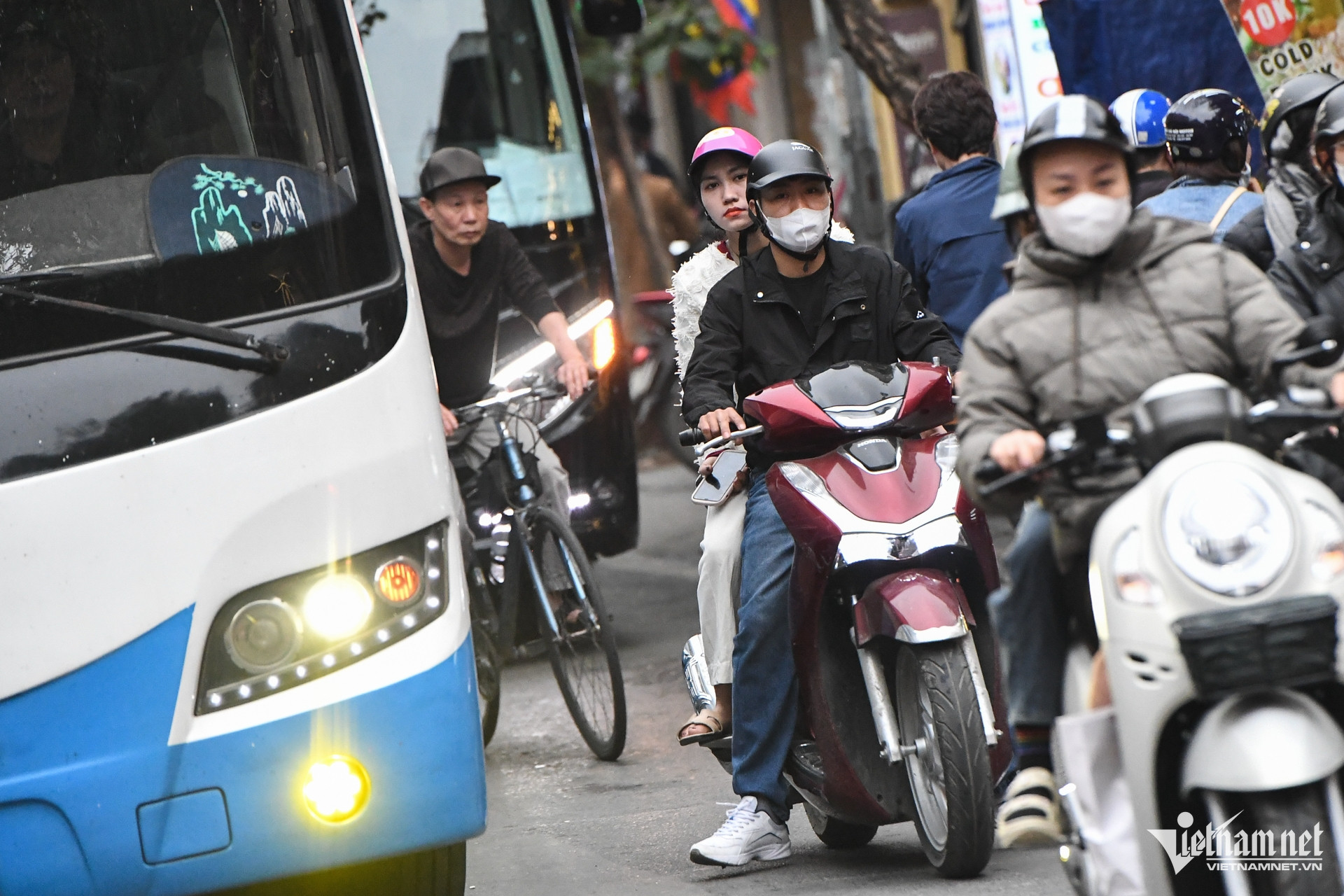 Một chiếc xe 45 chỗ di chuyển qua khu vực phố Hàng Đào rất nhỏ hẹp, người đi xe máy phải dừng lại nhiều phút hoặc chen vào các kẽ hở, phóng lên vỉa hè...