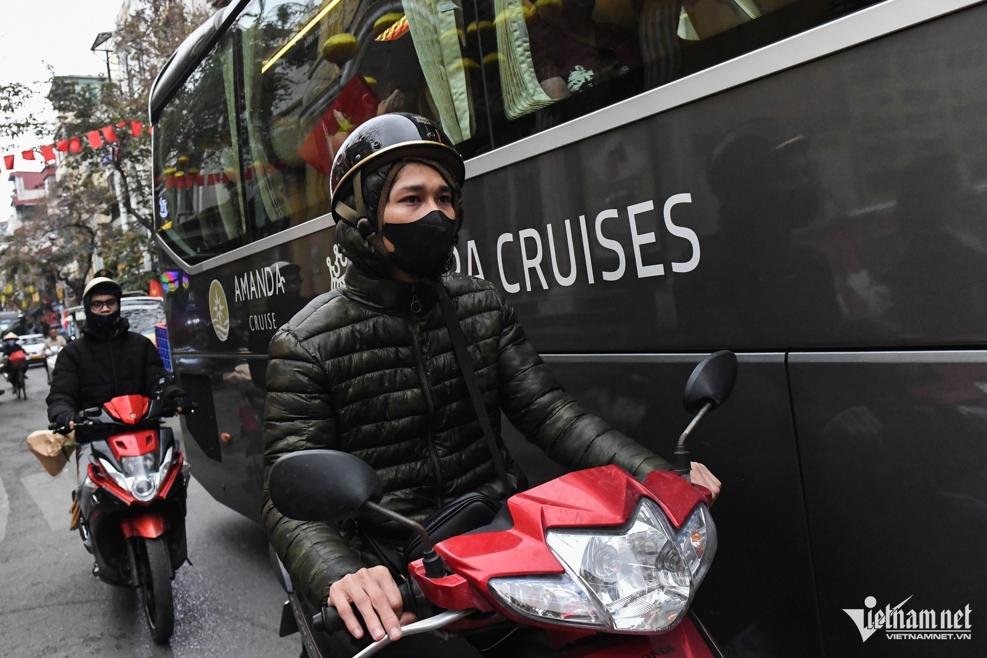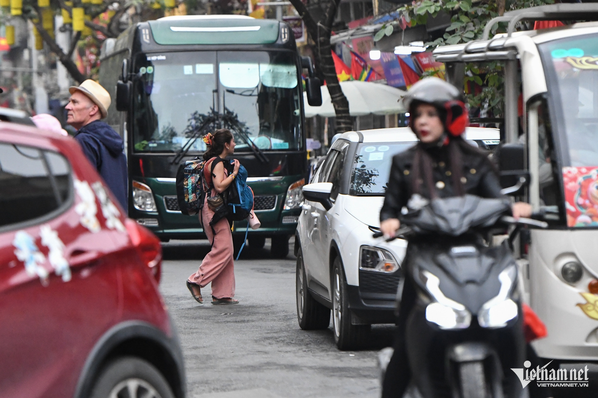 Cảnh tương tự tại phố Hàng Bạc, các xe 32 chỗ, 45 chỗ thường xuyên xuất hiện, thậm chí nối đuôi nhau di chuyển.