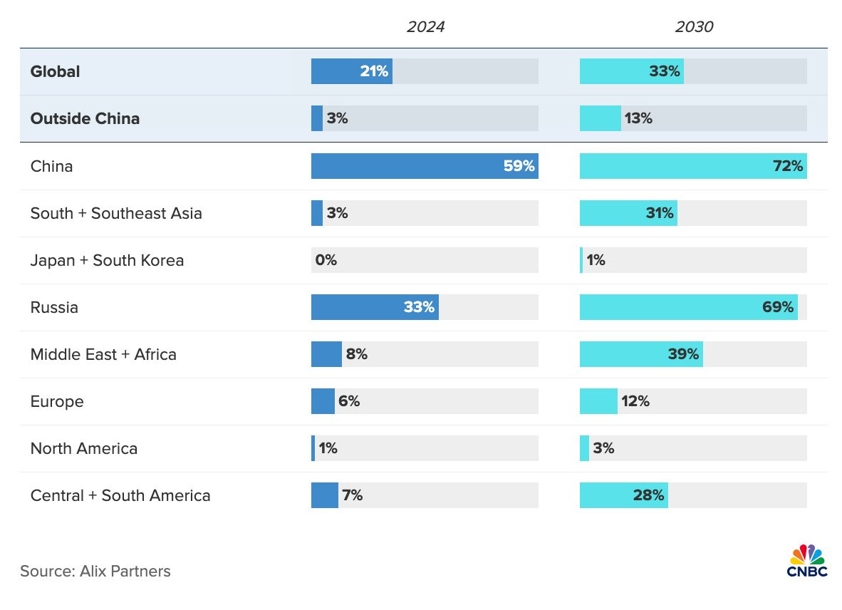 Tại hầu hết các khu vực lớn khác trên thế giới, báo cáo của AlixPartners cho thấy thị phần của các nhà sản xuất ô tô Trung Quốc dự kiến sẽ tăng theo cấp số nhân, đặc biệt là tại Trung Mỹ, Nam Mỹ, Đông Nam Á, Trung Đông và châu Phi.