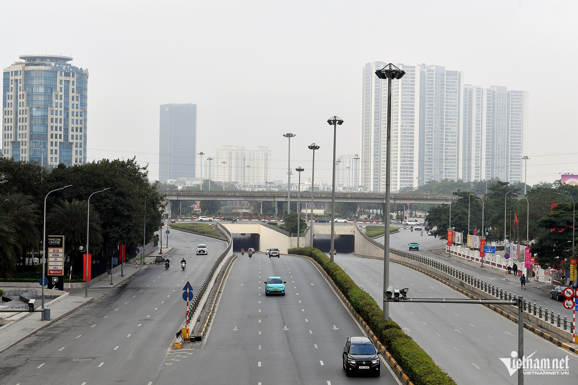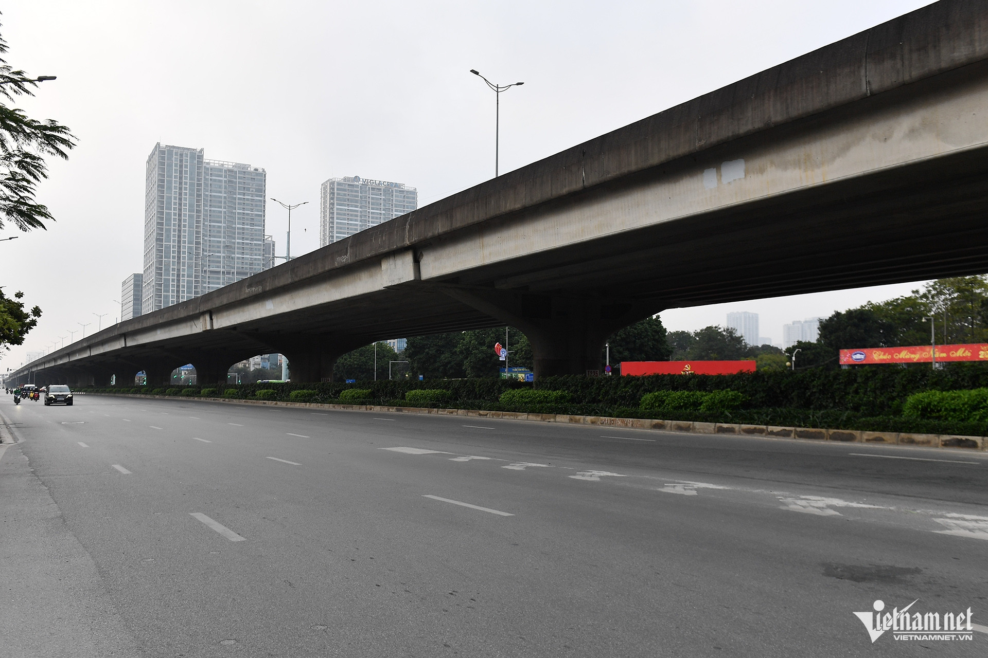 Đường Trần Duy Hưng đoạn gần ngã ba Hoàng Đạo Thúy cũng vắng phương tiện lúc 7h30 sáng 29 Tết.