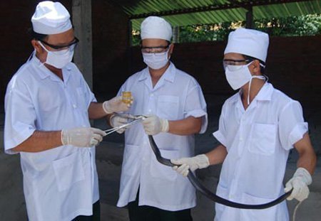 Cán bộ, nhân viên Trại rắn Đồng Tâm đang lấy nọc rắn (Ảnh: Kyluc.vn) |