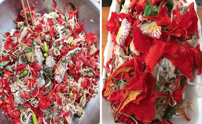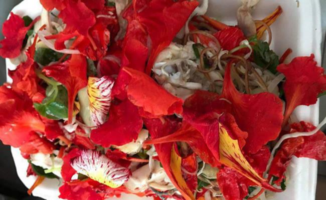 Trong vô vàn món nộm, món gỏi, chẳng ai ngờ rằng lại có món gỏi làm từ…hoa phượng, vừa ngon lại vừa đẹp mắt như thế này. Những cánh hoa phượng có vị chua nhẹ, thanh thanh, được nhiều người sử dụng làm thực phẩm.