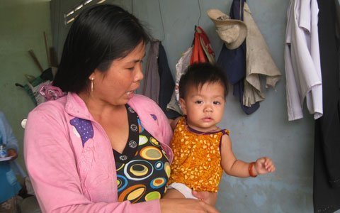 | Chị Nguyễn Thị Thu Trang bế con gái 9 tháng tuổi vừa đi khám về bị bệnh viễm mũi và đường hô hấp. |