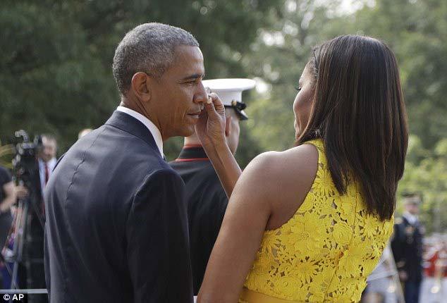 Đệ nhất phu nhân Mỹ Michelle Obama đã đưa tay lau mũi cho chồng trước đám đông ở thủ đô Washington.