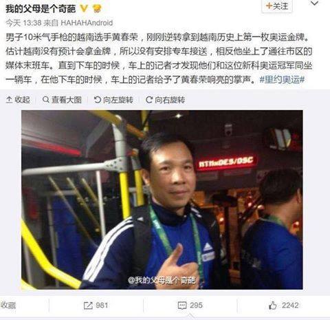Trên trang xã hội Weibo của Trung Quốc hôm qua (7/8) đăng tải hình ảnh Hoàng Xuân Vinh sau khi lập kỷ lục Olympic và giành HCV, tạo nên kỳ tích cho thể thao Việt Nam nhưng không có xe đưa đón. Thay vào đó, xạ thủ người Việt Nam phải lặng lẽ về trung tâm thành phố bằng chuyến xe cuối cùng của truyền thông từ ngoại ô về trung tâm thành phố.