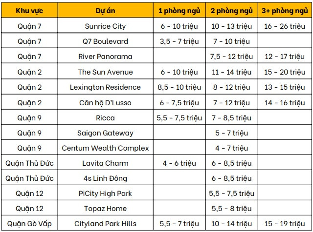 Thống kê, phần lớn các căn hộ được người đi thuê ưa chuộng nằm ở khu vực TP.Thủ Đức với tỷ trọng chiếm khoảng 70%. Giá thuê của các căn hộ chung cư này dao động ở mức 5 - 7 triệu đồng/tháng cho căn 1 phòng ngủ; từ 8 - 10 triệu đồng/tháng cho căn hộ 2 phòng ngủ; khoảng 14-16 triệu đồng/tháng cho căn từ 3 phòng ngủ trở lên.