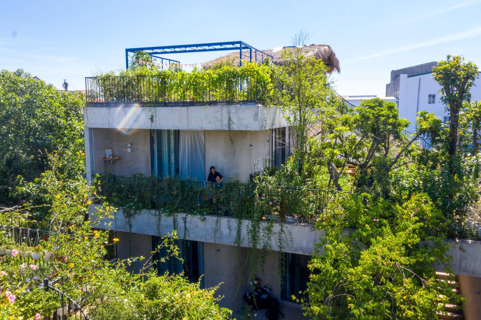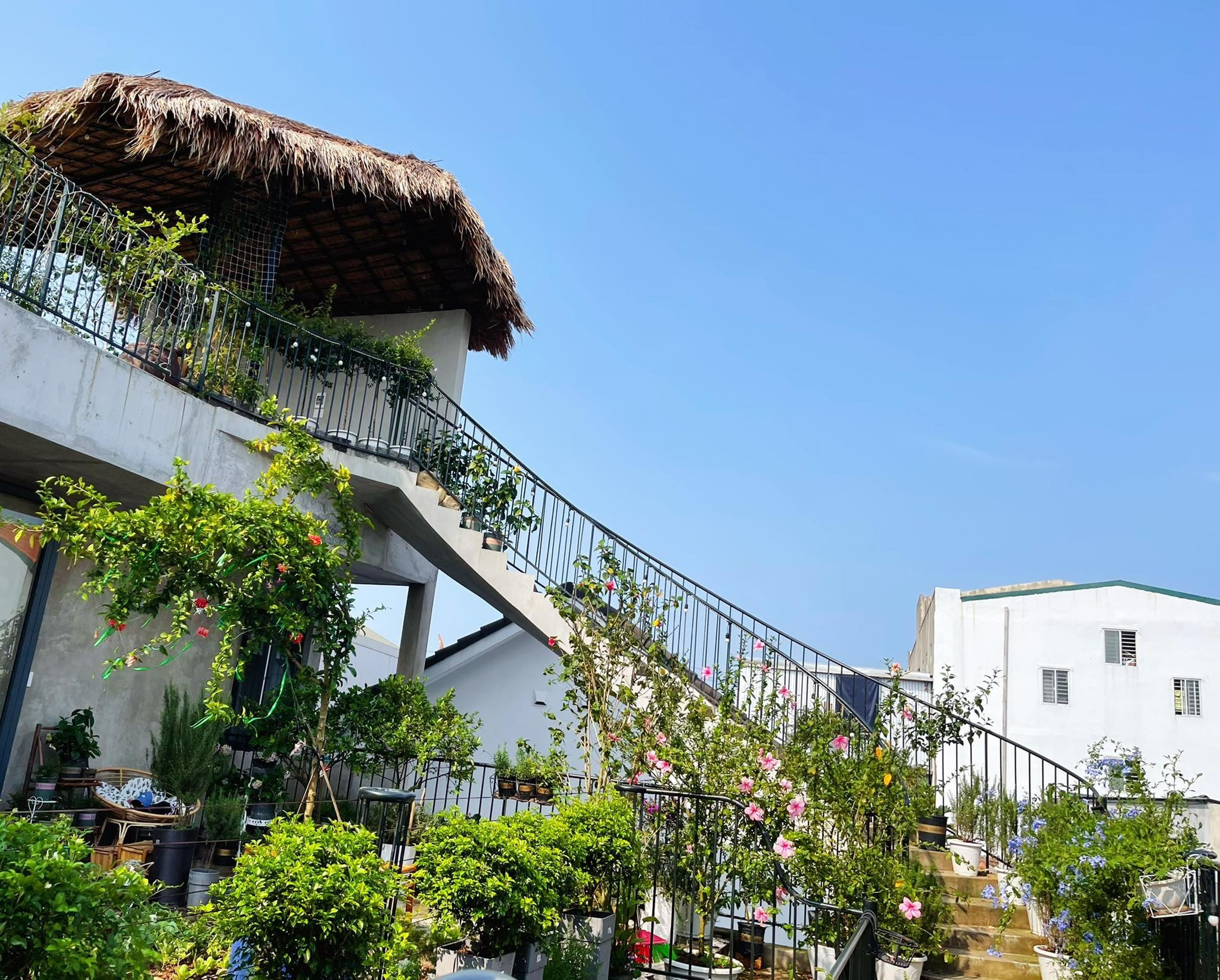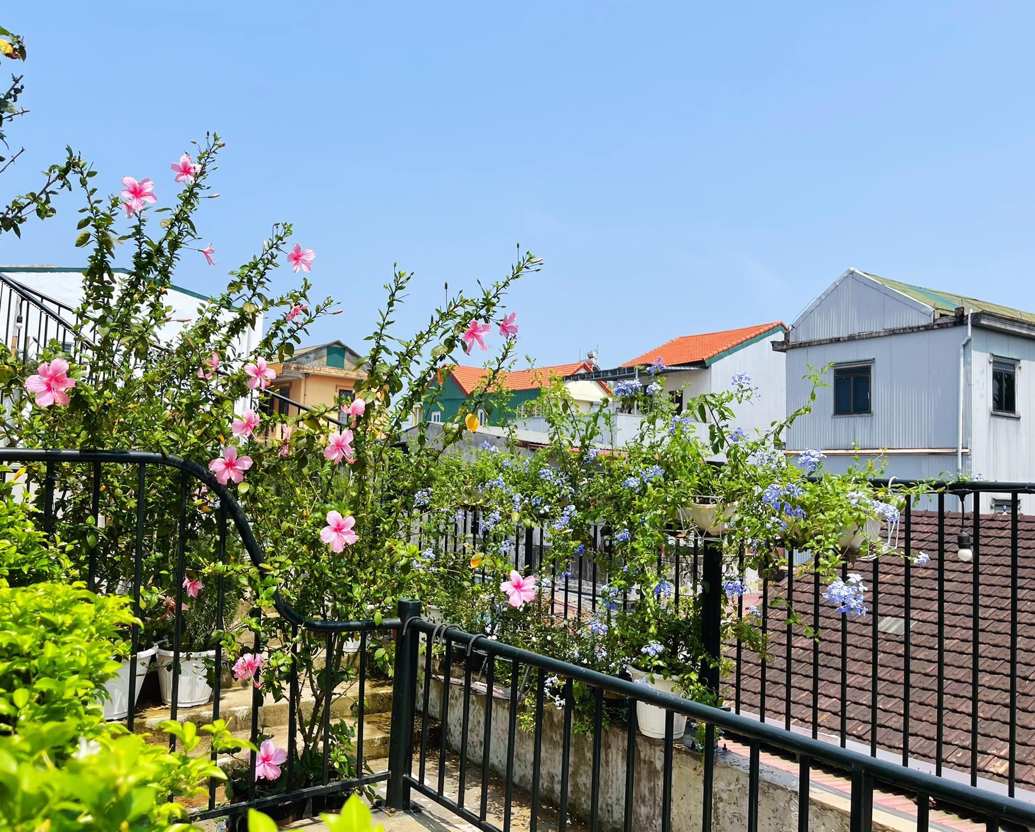 Khu vườn "bay" giữa không trung đẹp như cổ tích của gia đình anh Tùng. Hệ thực vật phủ xanh mái nhà khiến nhiệt độ bên trong chênh lệch với ngoài trời vài độ.