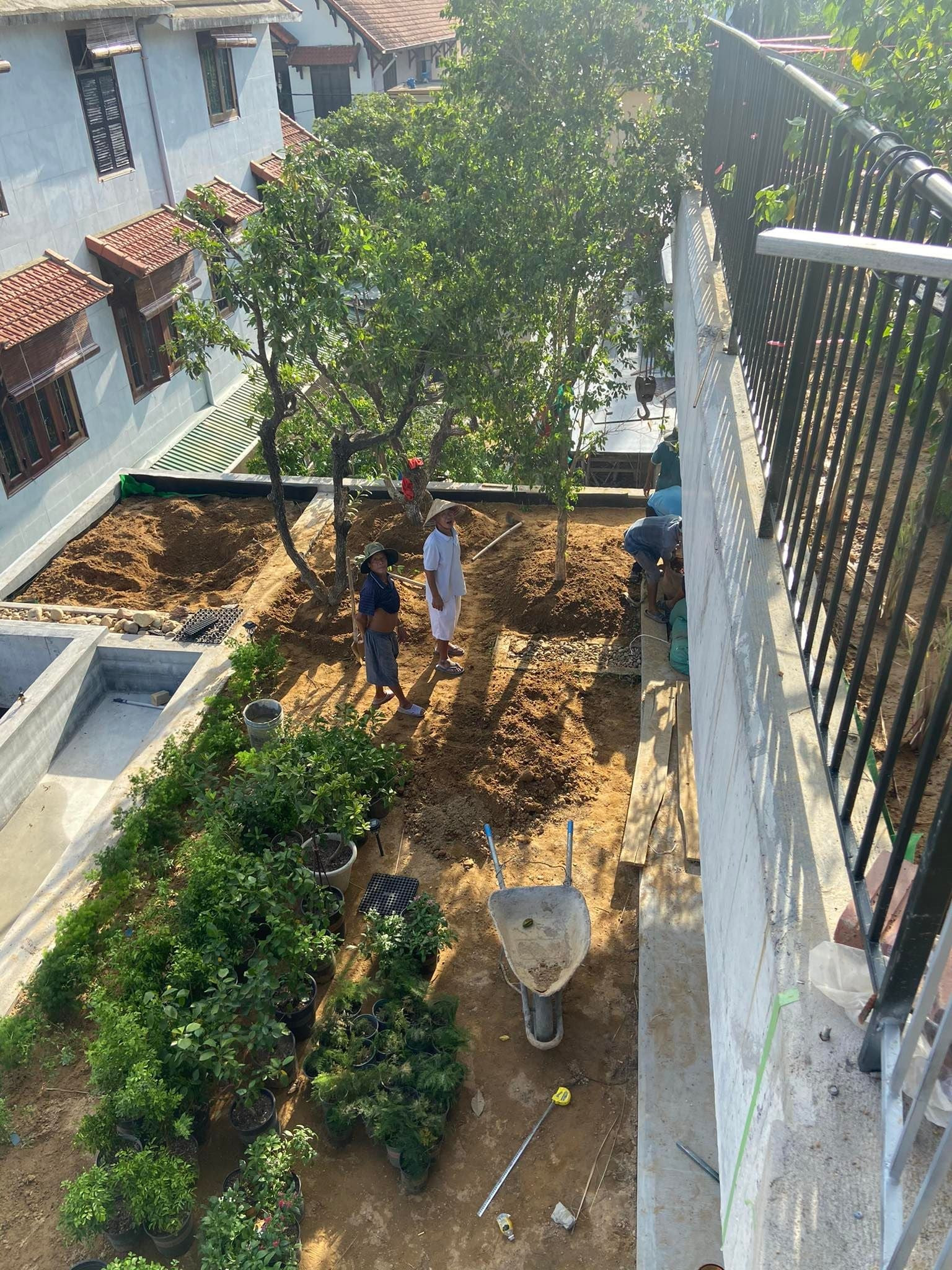 Các giai đoạn từ đổ đất, trồng cây và làm bể bơi.