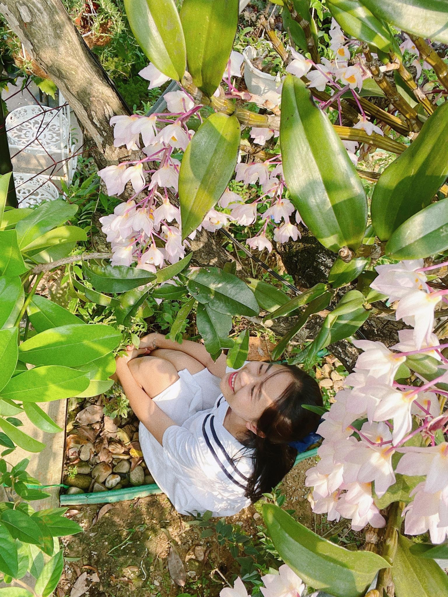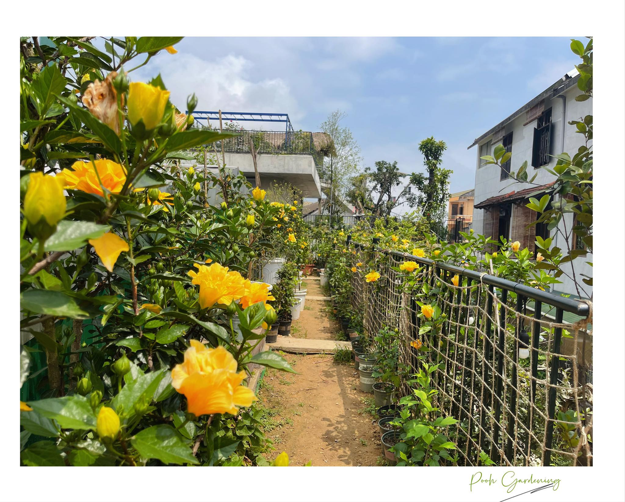 Vườn cây của anh Tùng có khoảng 40 loại, gồm: Cây cảnh, rau xanh, cây ăn trái đan xen. Cụ thể: Dạng cây leo bò là kim ngân hoa - loại cây leo người miền bắc xưa hay ướp trà, xen kẽ thanh xà bạch xà, chè vằng làm cảnh quan và râm bụt để lấy hoa.