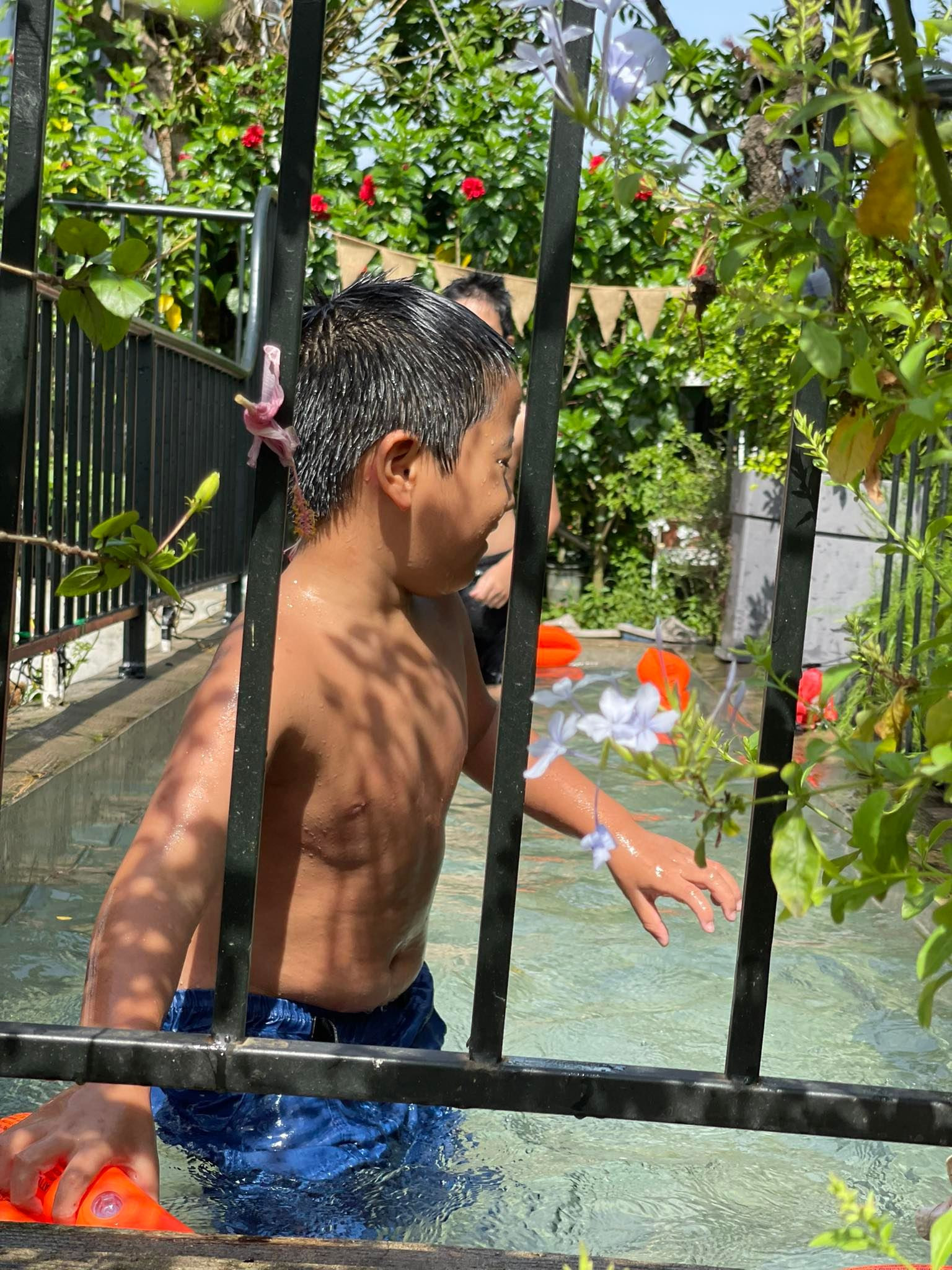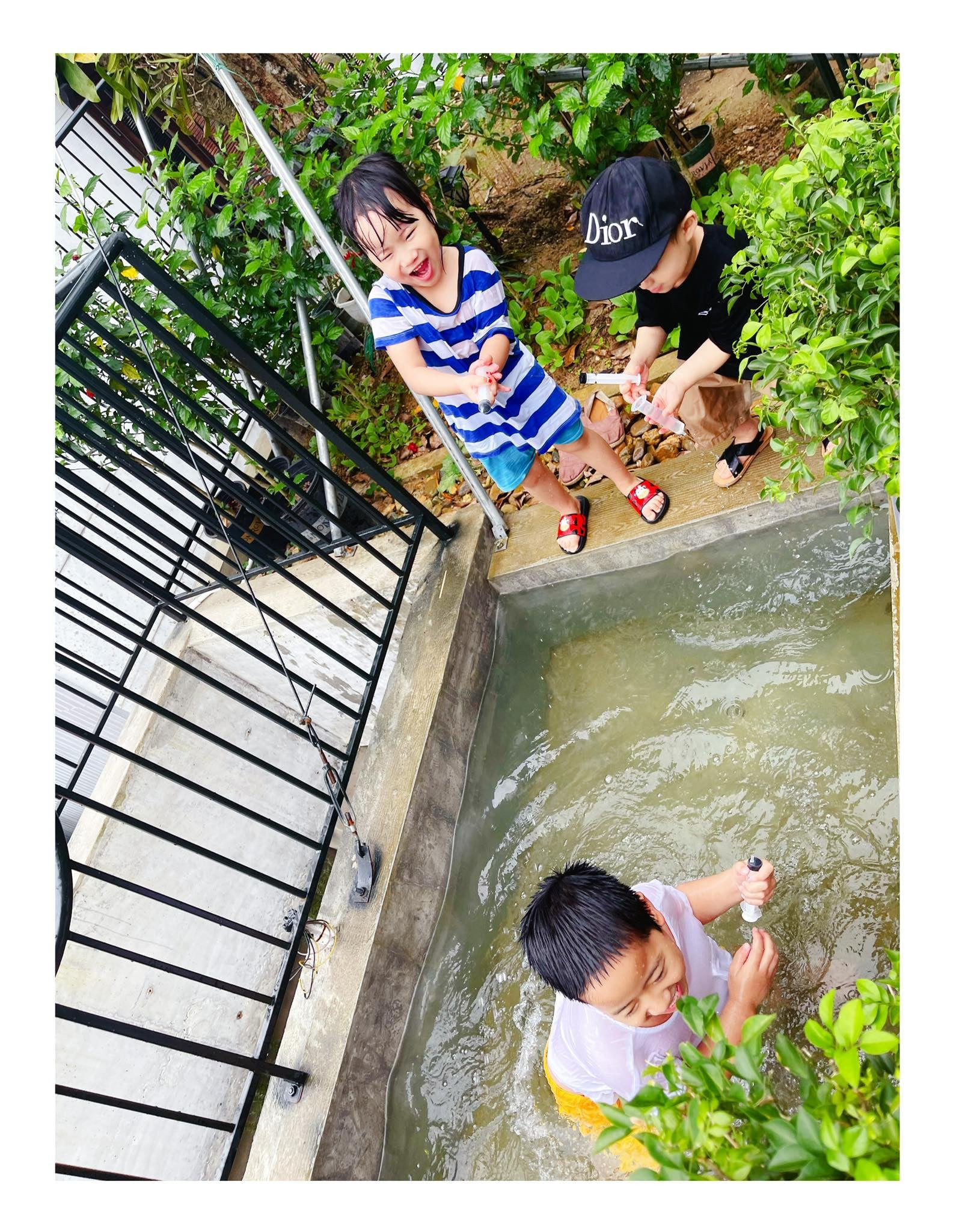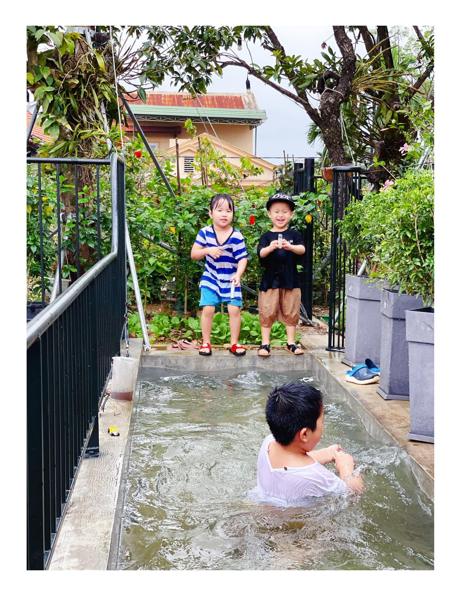Ngoài vườn cây, anh Tùng thiết kế bể bơi mini rộng khoảng 5 – 6m2 cho các con bơi lội. Bể xây theo kiểu xả đáy, 1 tuần anh vệ sinh sạch, xả nước máy vào, không dùng clo khử độc.
