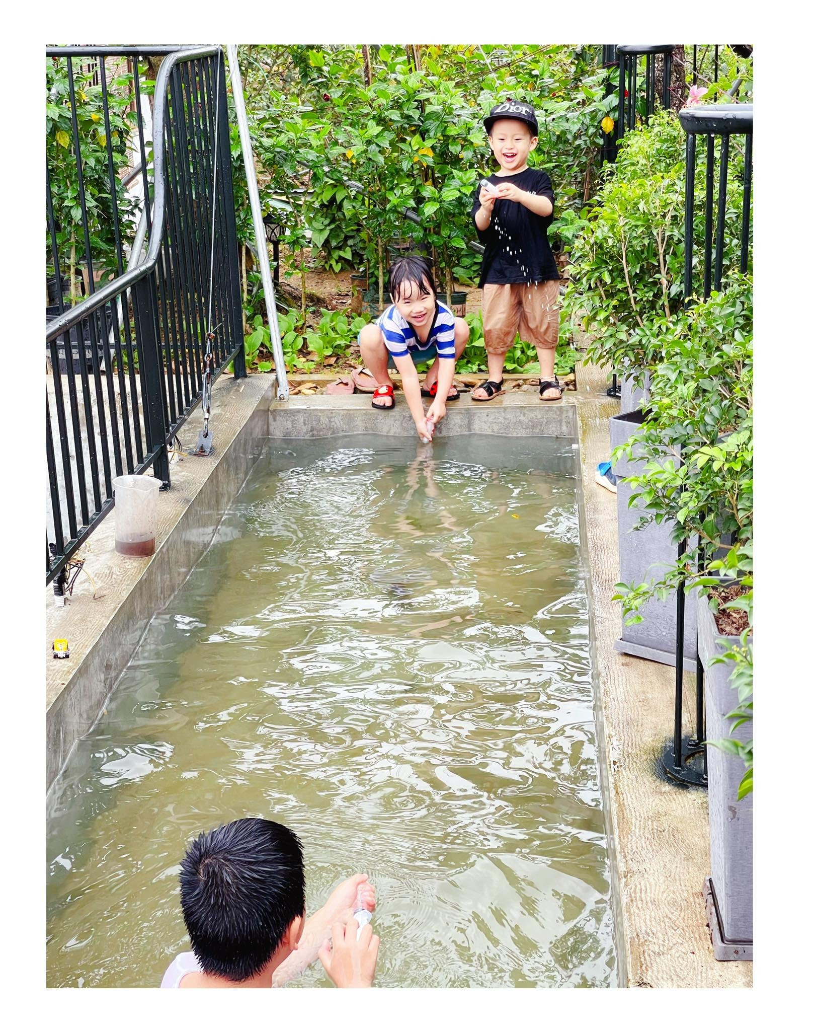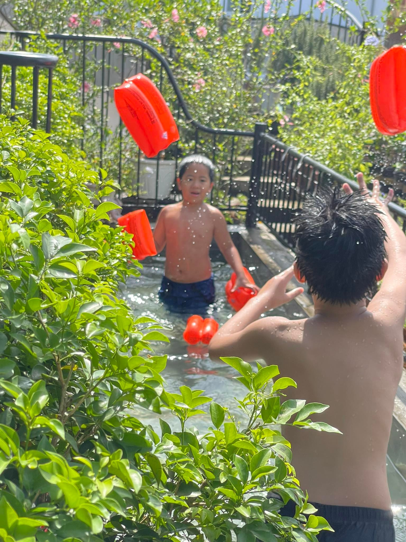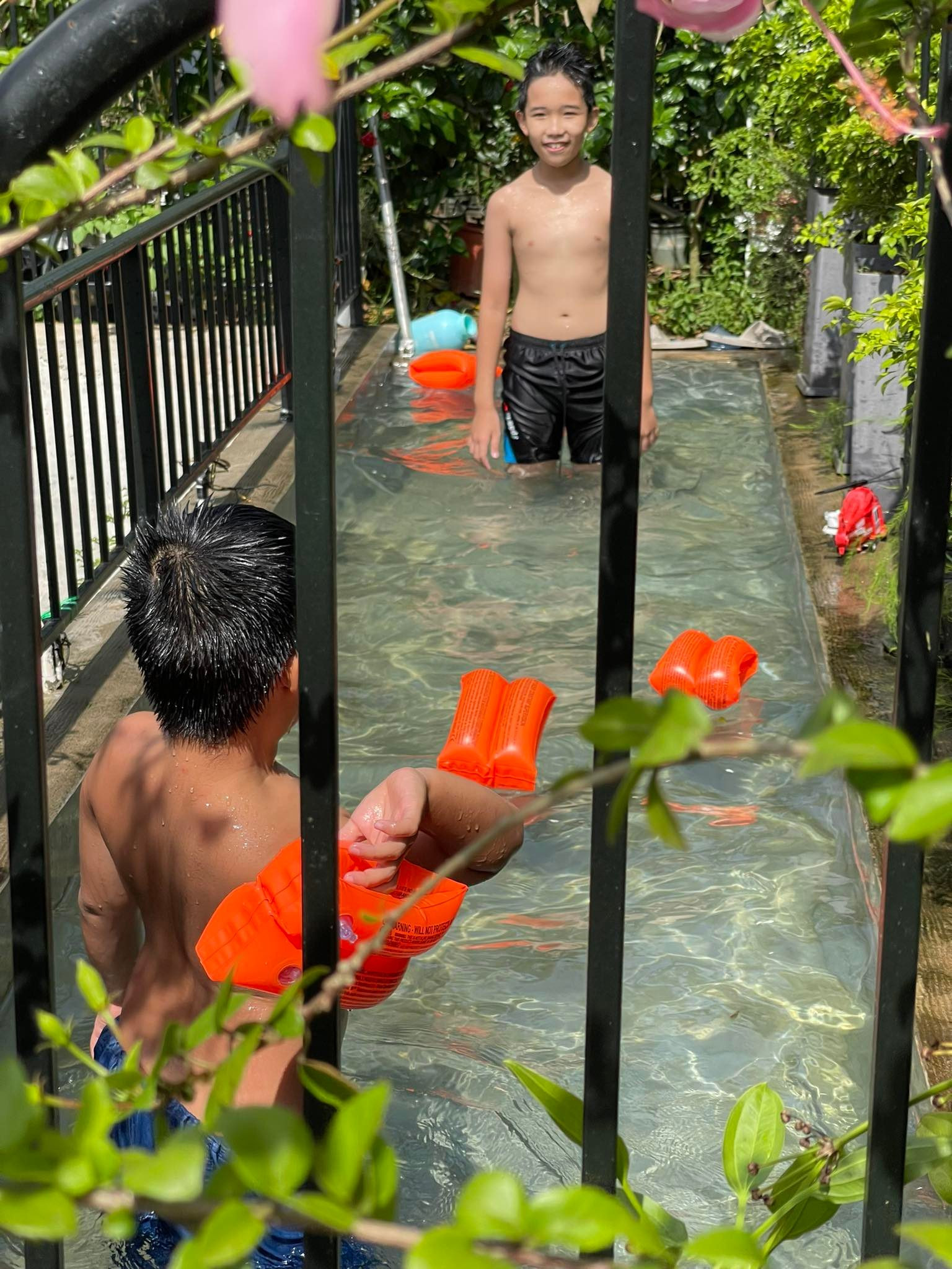 Ngoài vườn cây, anh Tùng thiết kế bể bơi mini rộng khoảng 5 – 6m2 cho các con bơi lội. Bể xây theo kiểu xả đáy, 1 tuần anh vệ sinh sạch, xả nước máy vào, không dùng clo khử độc.
