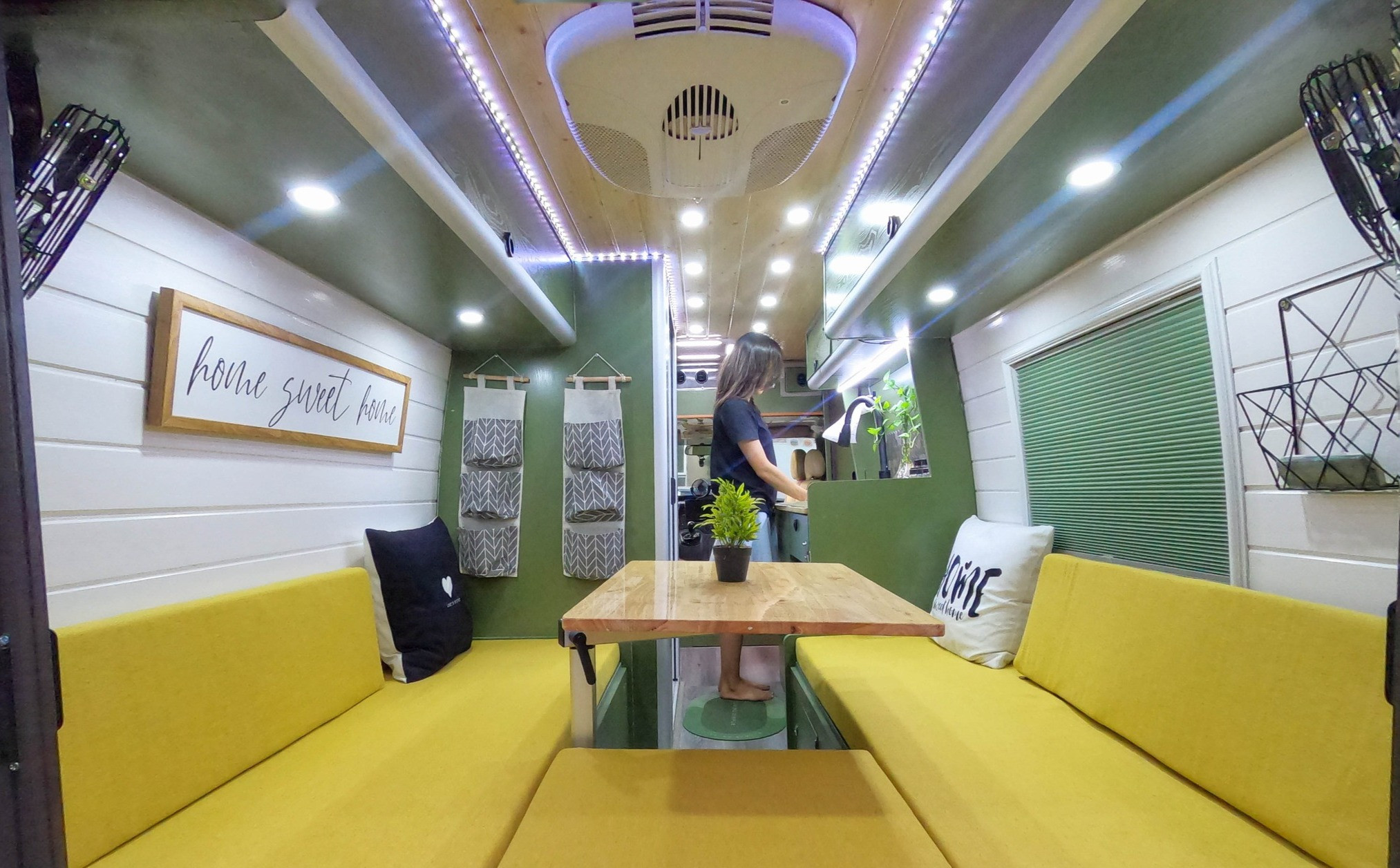 “Ngôi nhà di động” thứ 7 của gia đình Hà Nội được cải tạo từ chiếc xe 16 chỗ Ford Transit đời 2010. Trên xe có đầy đủ giường ngủ, bếp, nhà vệ sinh, các kệ để đồ, điều hòa, nước sạch…