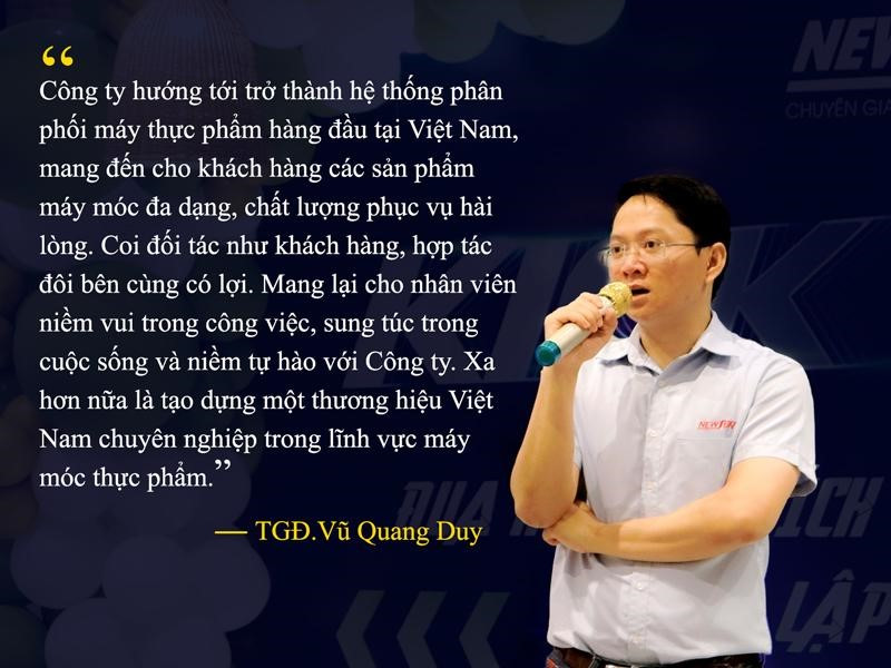 Anh Vũ Quang Duy chia sẻ: “Khi thấy nước bạn sản xuất máy chế biến thực phẩm, có những sản phẩm tốt, song vẫn có những sản phẩm còn nhiều hạn chế với người dùng Việt, giá thành còn cao. Từ đó, tôi tính đến những “bài toán” lâu dài là chủ động sản xuất trong nước để đảm bảo phục vụ tốt nhu cầu của khách hàng, đồng thời xây dựng thương hiệu NEWSUN (Mặt trời mới)”.