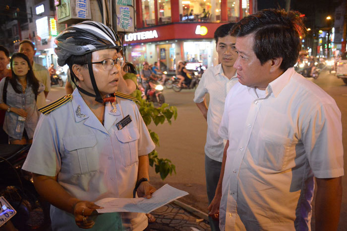 | Ông Đoàn Ngọc Hải, Phó chủ tịch Q.1 chỉ đạo đoàn liên ngành kiểm tra, xử lý các trường hợp vi phạm trật tự đô thị |